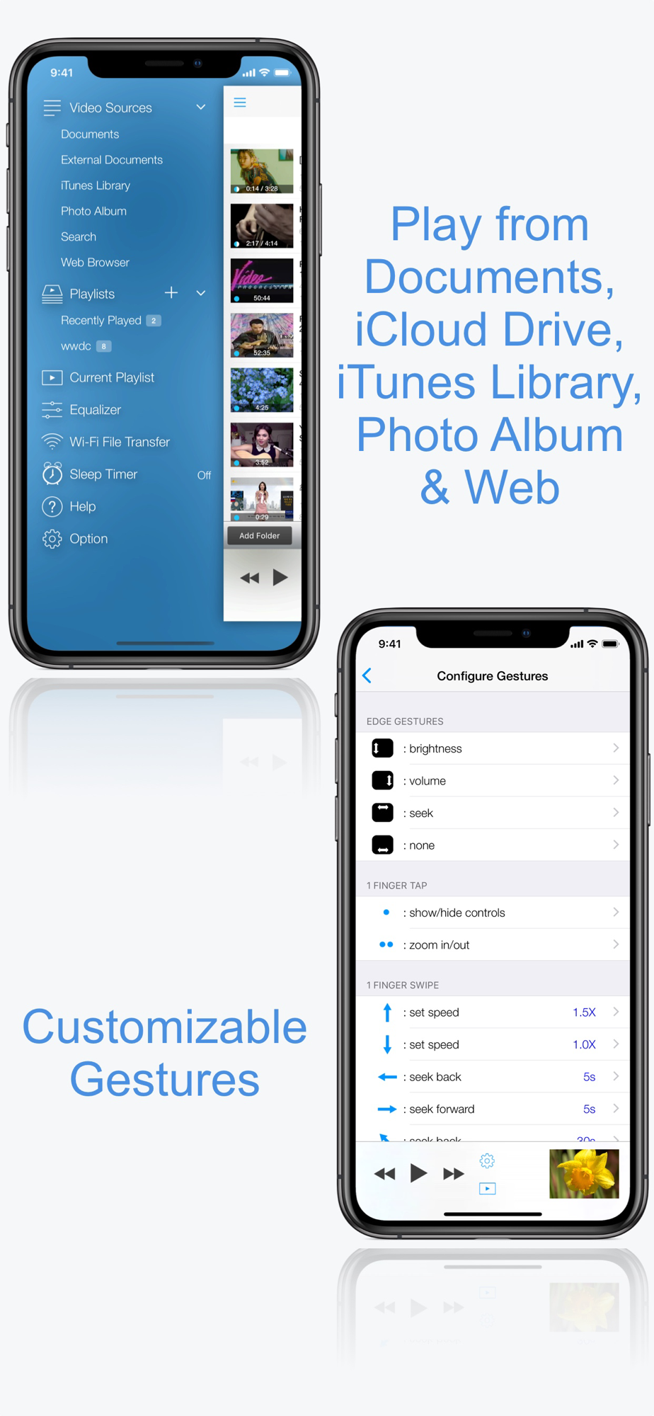 * Play videos from documents, external documents(iCloud Drive and videos from other apps), iTunes library, and camera roll.