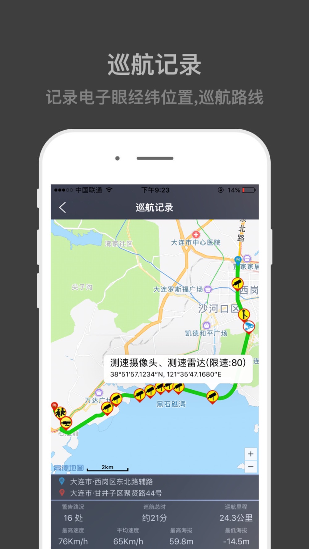 (6)【行驶轨迹】地图中清晰地标示遇到的提醒路况,精准地绘画行驶轨迹。