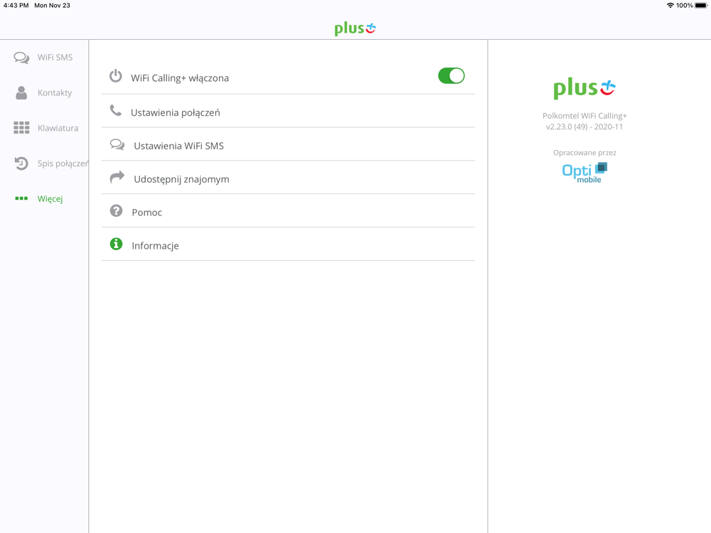 Aplikacja Wi-Fi Calling+ umożliwia wykonywanie i odbieranie połączeń głosowych oraz wysyłanie i odbieranie wiadomości tekstowych gdy nie masz zasięgu sieci ale masz dostęp do Wi-Fi. Usługa skierowana jest do Klientów sieci Plus, którzy posiadają aktywną bezpłatną usługę Aplikacyjne Wi-Fi Calling+. Usługa świadczona jest na zasadach opisanych szerzej w Regulaminie „Aplikacyjne Wi-Fi Calling+” dostępnym na www.plus.pl/wificalling.