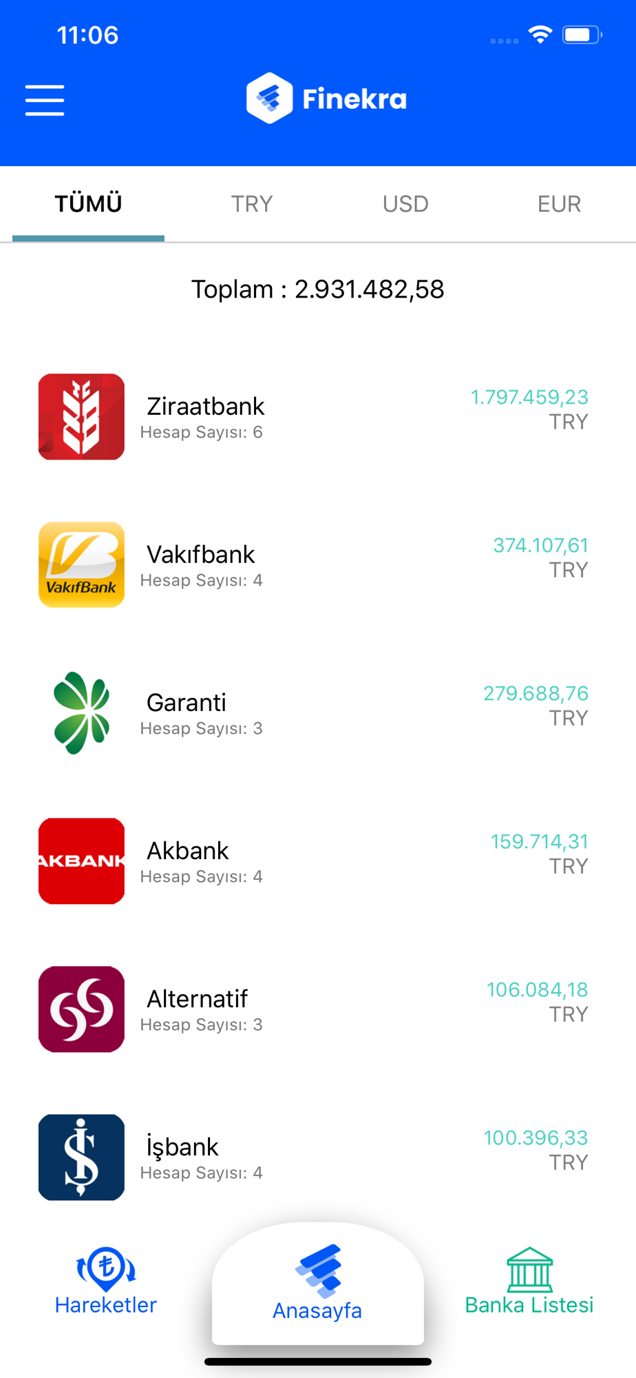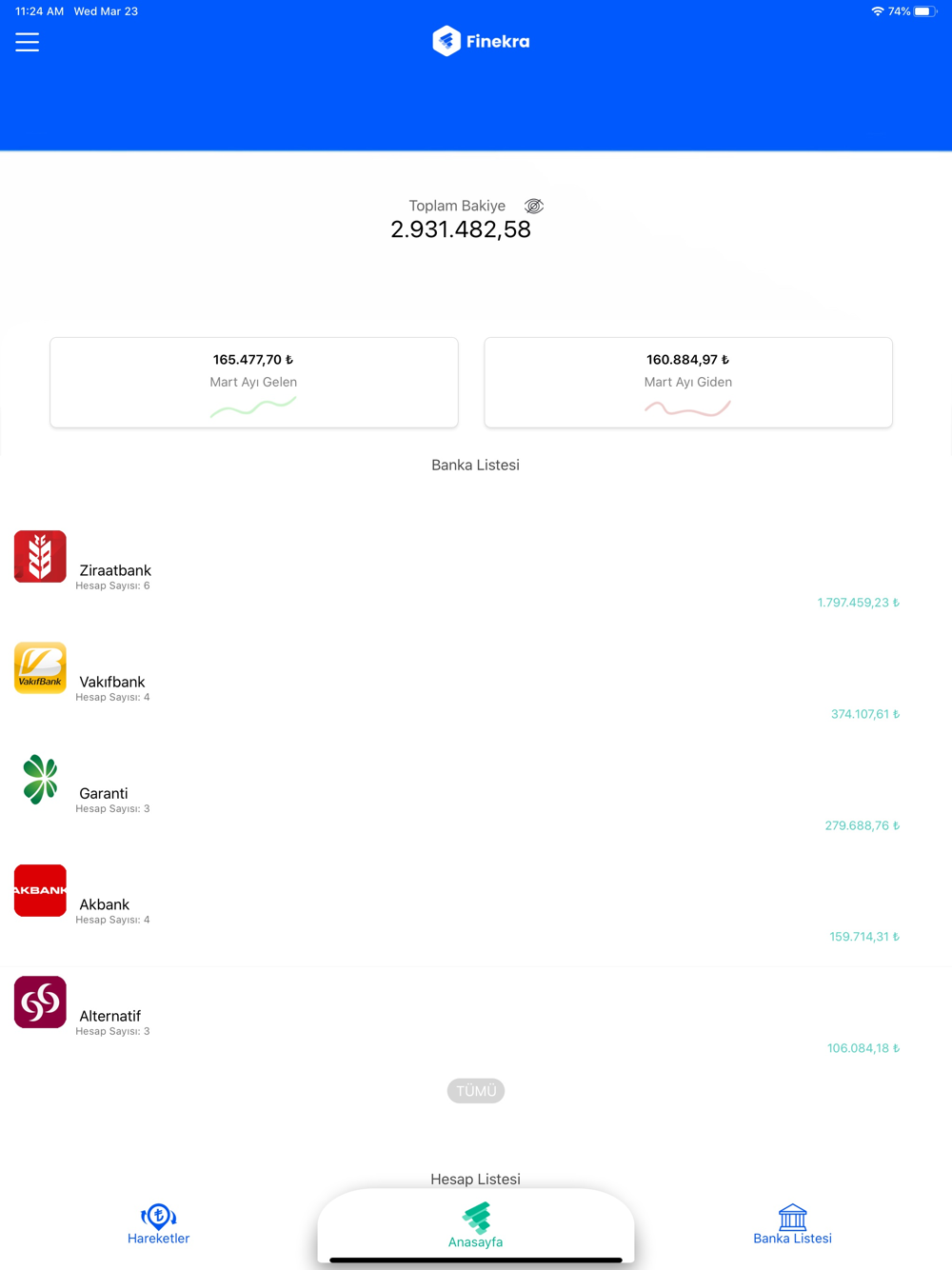 Finekra ile tüm banka hesap bakiyelerinizi ve hesap hareketlerinizi tek ekrandan, tek şifre ile takip edebilirsiniz.