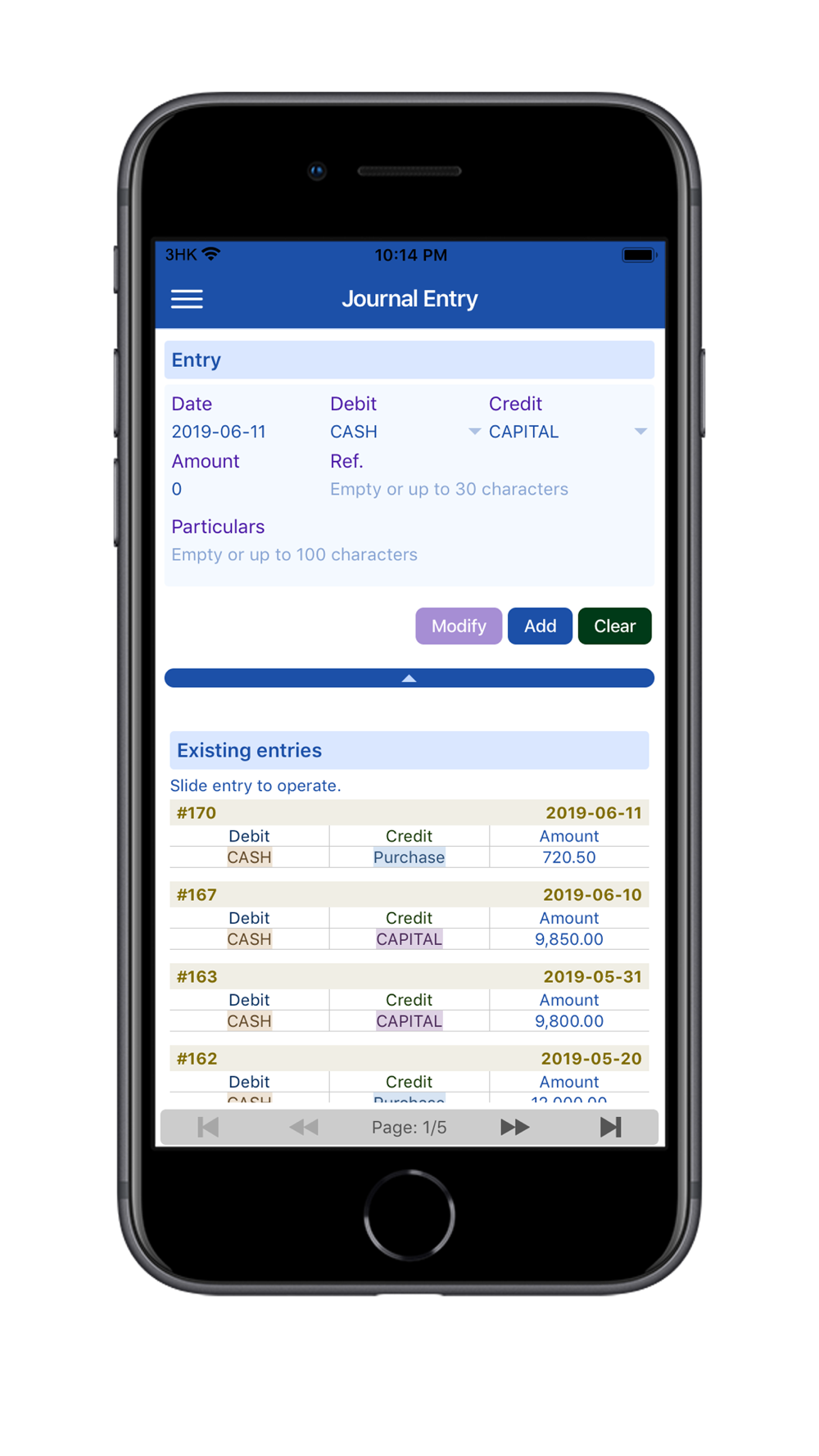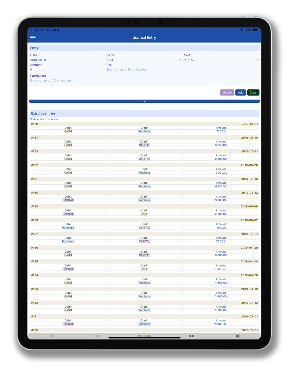 - Accounts: Allows user to create accounts for debiting and crediting.