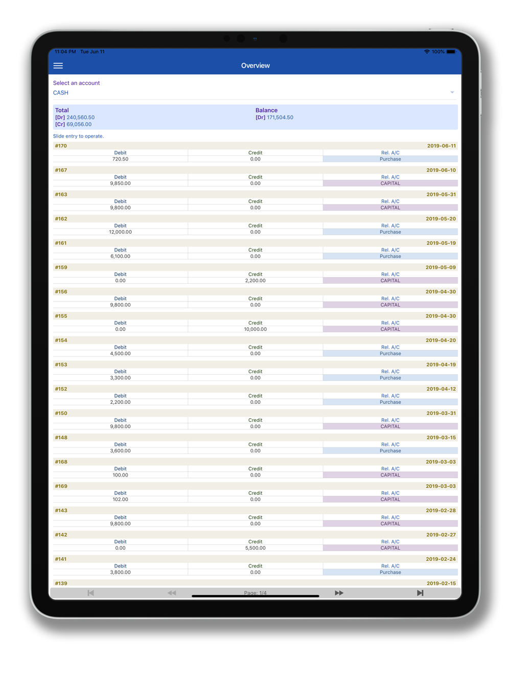 - Overview: Displays entries for selected account.