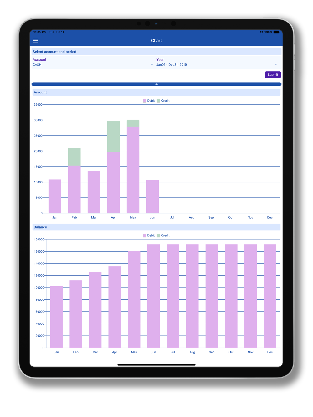 - Chart: Generates annual amount and balance charts for selected account.