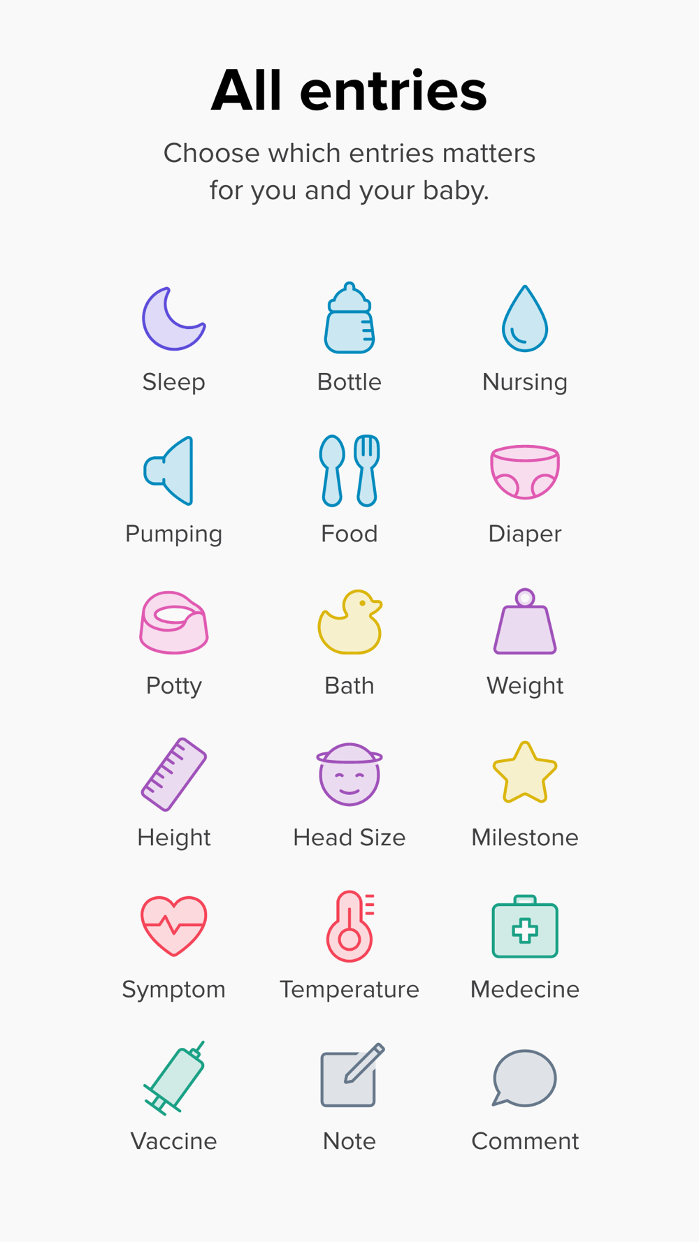 • Add your own milestones, health symptoms, medicines, and vaccines, alongside our presets