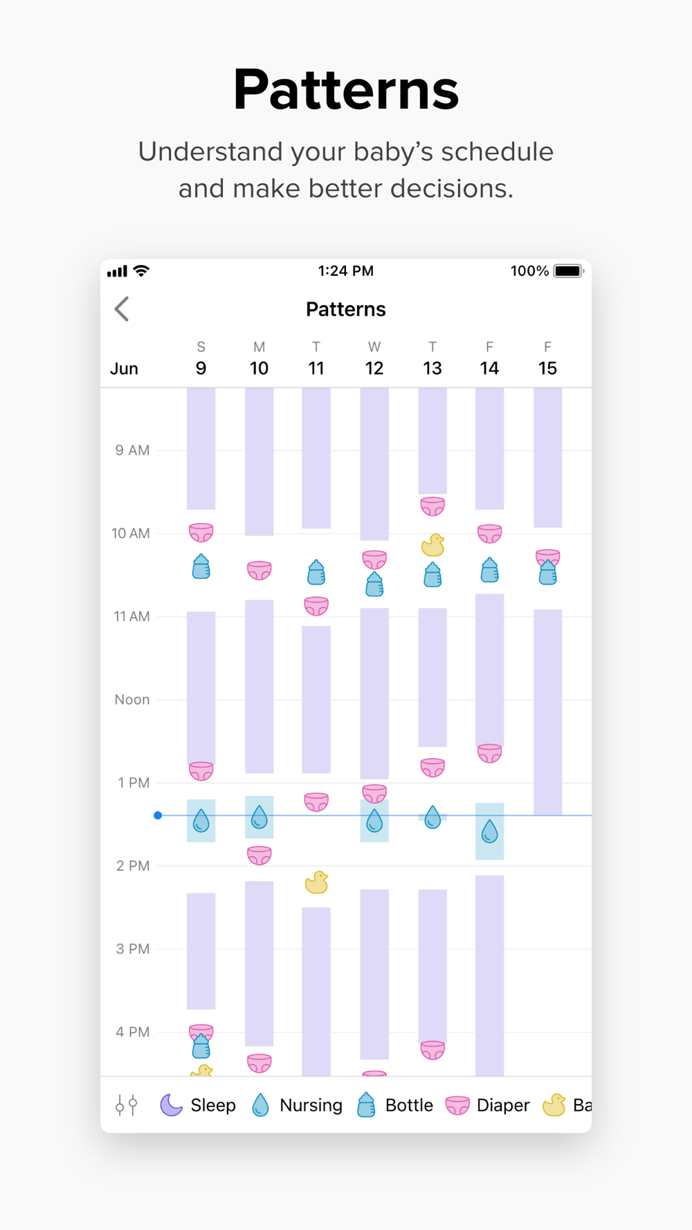 • Activity patterns: visualize the times of day when your child sleeps, feeds, and more