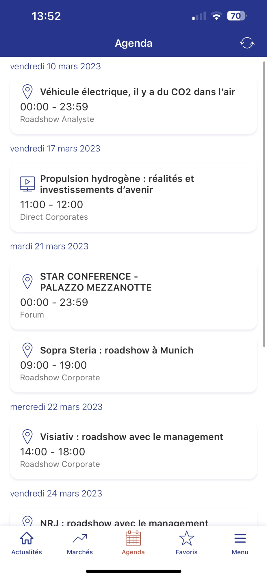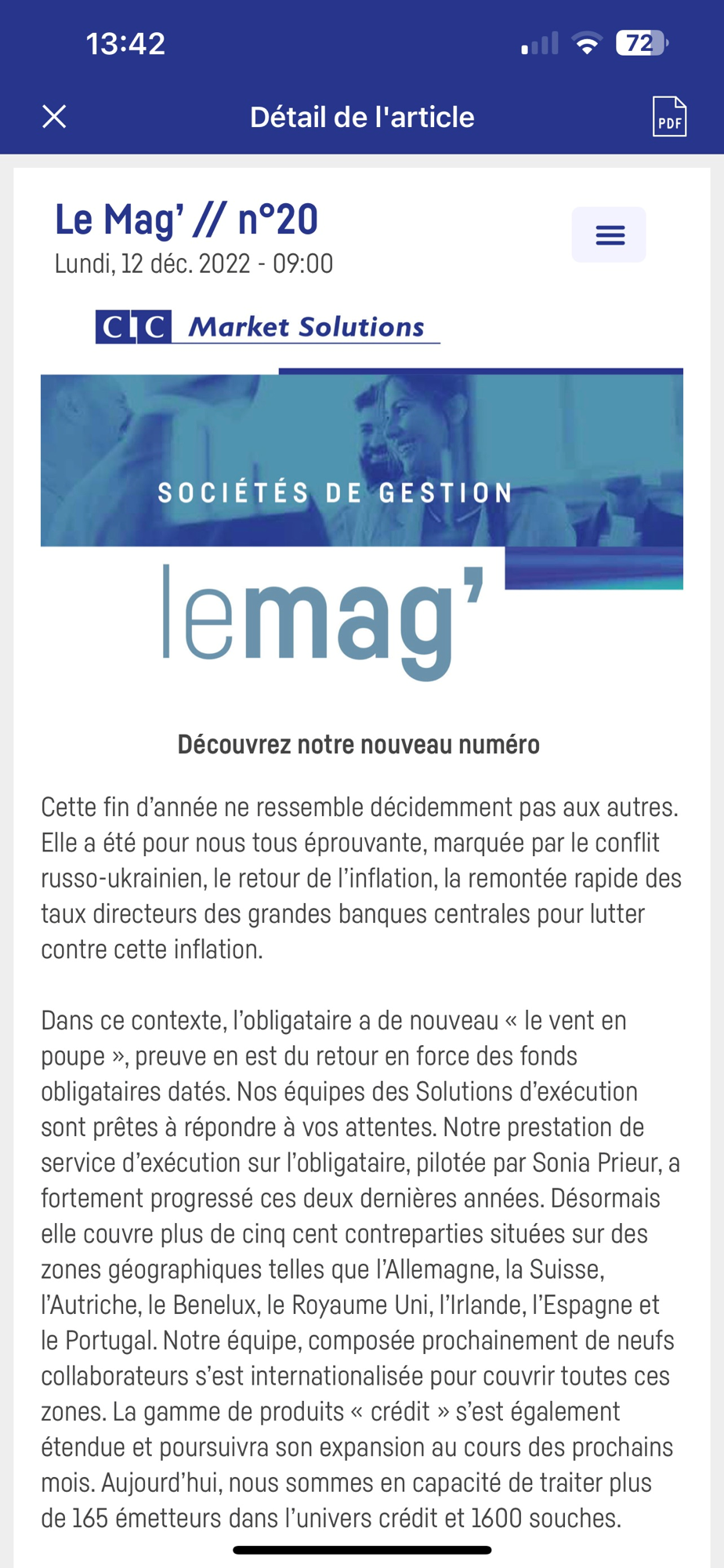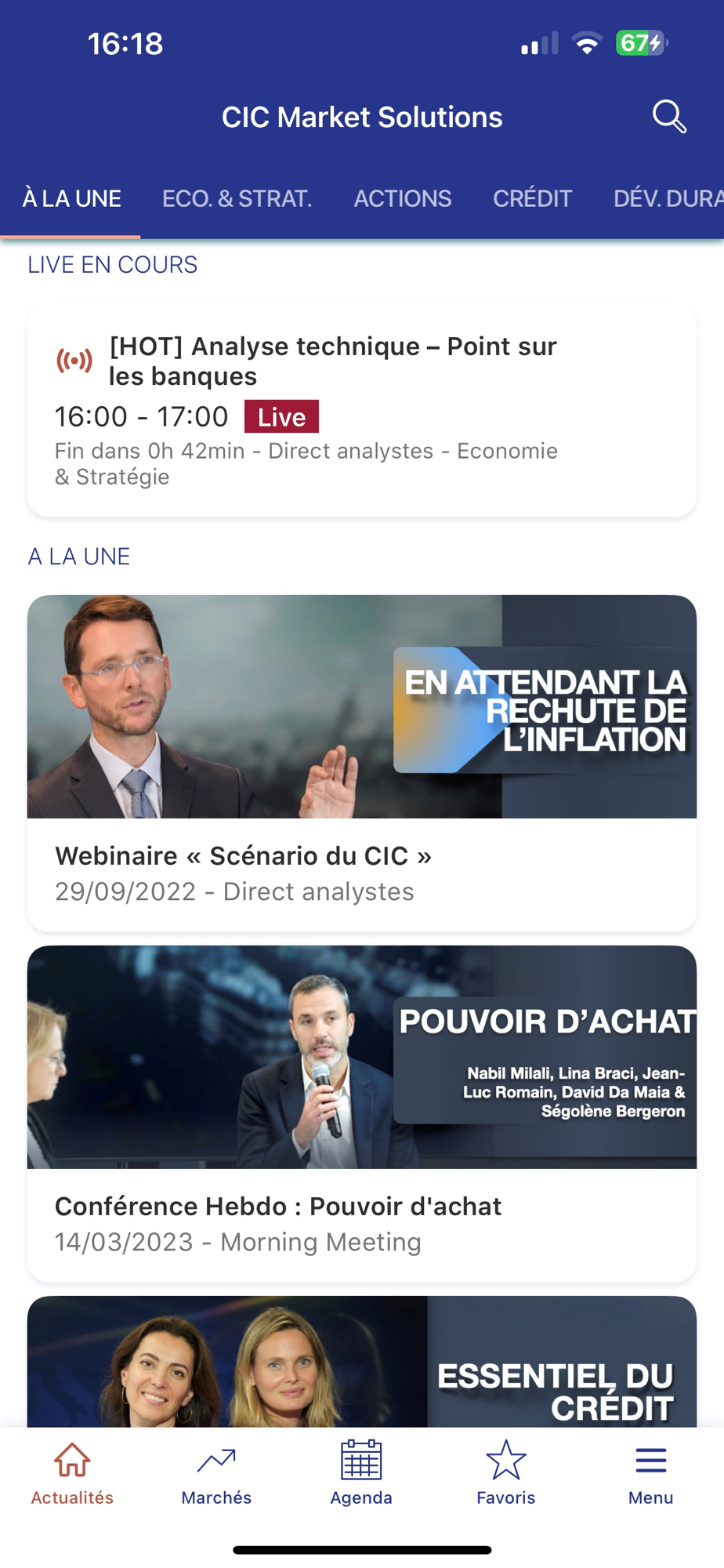 CIC Market Solutions vous présente son application mobile qui met nos expertises à portée de main. L’accès est réservé aux clients professionnels. Enrichie quotidiennement, elle offre des contenus exclusifs et des éclairages utiles à vos prises de décision. Visionnez, en live ou en replay, les interventions de nos analystes qui décryptent l’actualité des marchés. Retrouvez une sélection de nos publications d’analyse financière quotidiennes, et nos focus sectoriels réguliers. L’application vous offre également accès au point de vue de nos experts, de façon réactive, en cas d’actualités majeures impactant les marchés ou un émetteur. Elle donne la parole aux émetteurs : percevez au mieux la vision et la stratégie des sociétés cotées, par ceux et celles qui les dirigent. L’agenda vous permet de vous inscrire à nos événements et d’y participer en direct.