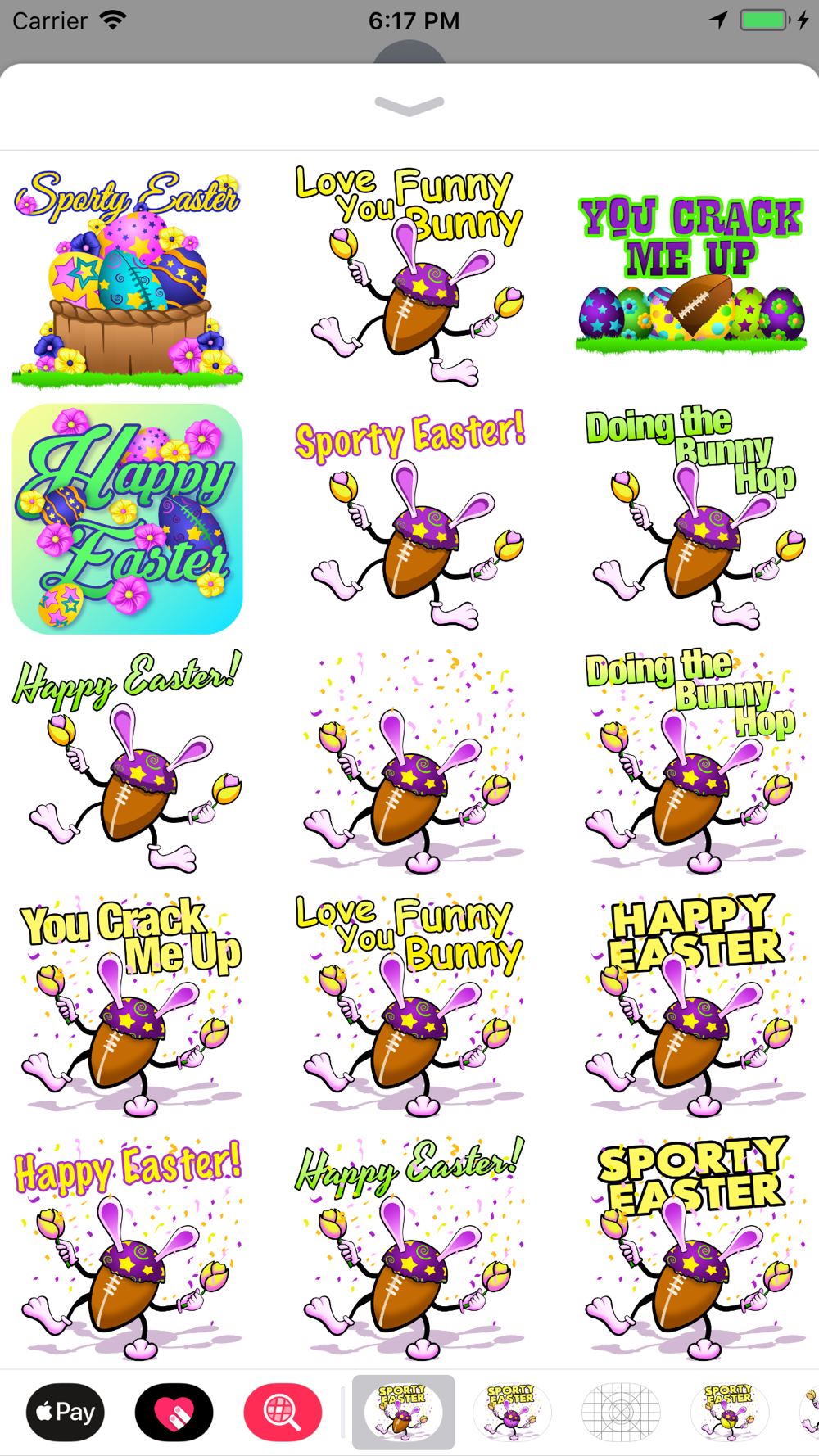 A set of football Easter stickers with dancing bunnies, Easter baskets, painted eggs, and flowers.