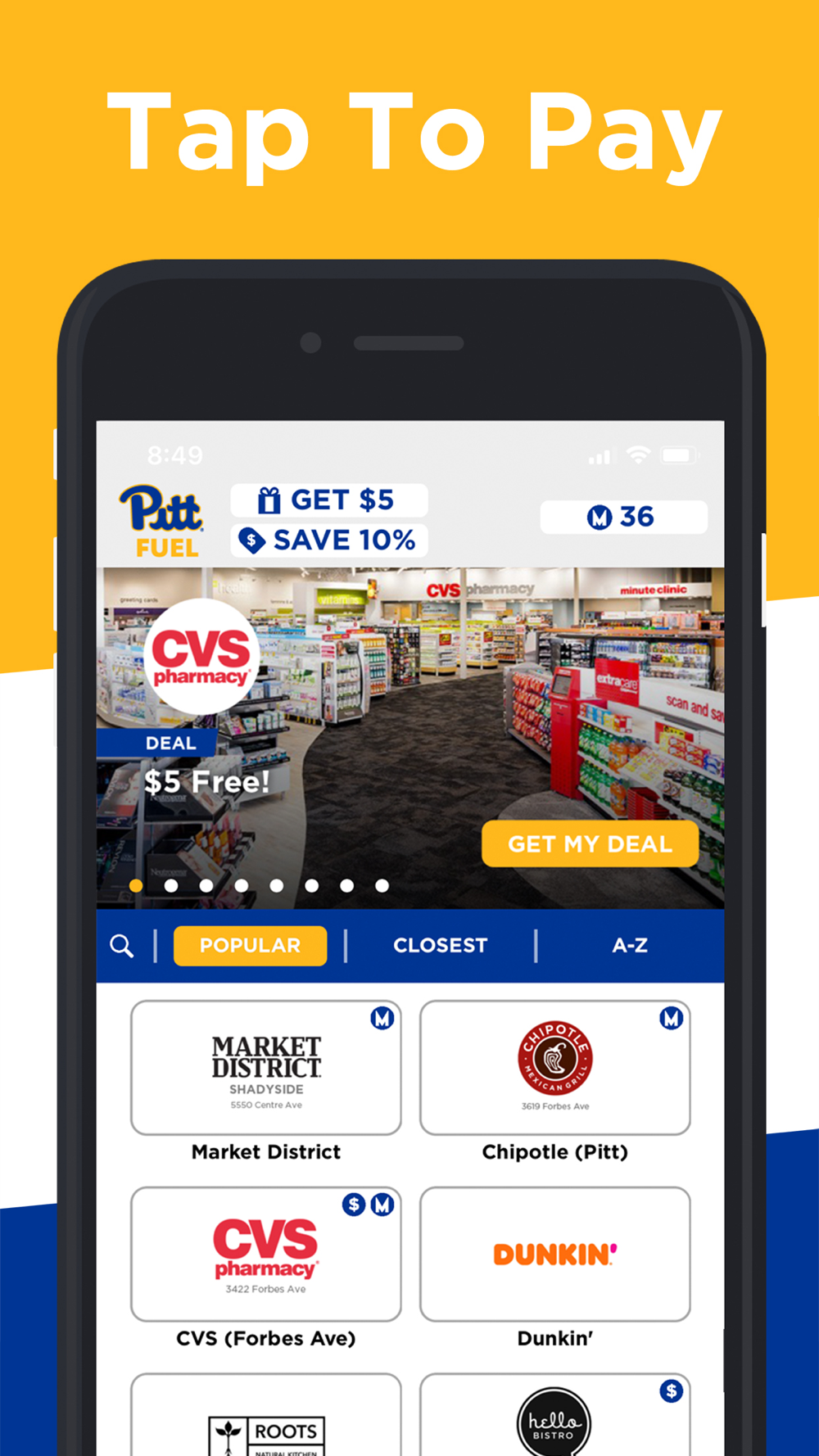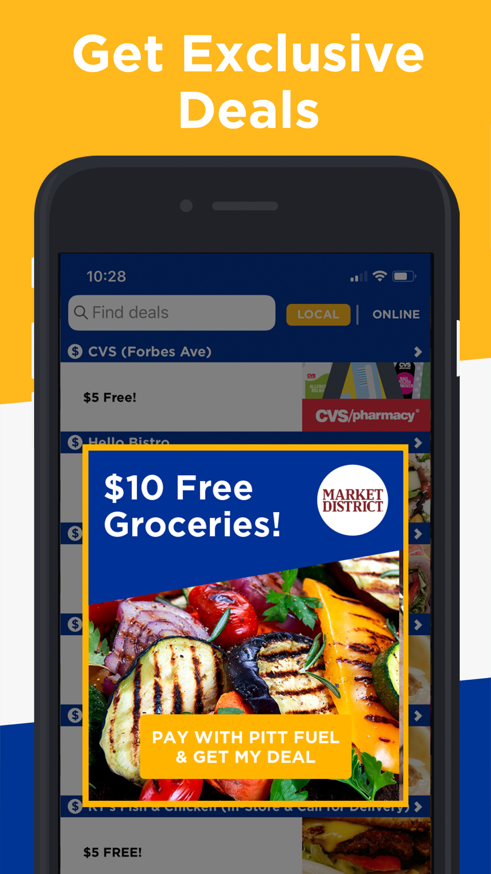 The free Pitt Fuel app is the best way to make your grocery, food, and essentials spend go further. You can pay, save, and earn rewards with Pitt Fuel at Market District, Chipotle, CVS, Dunkin', Roots, GetGo, and more!