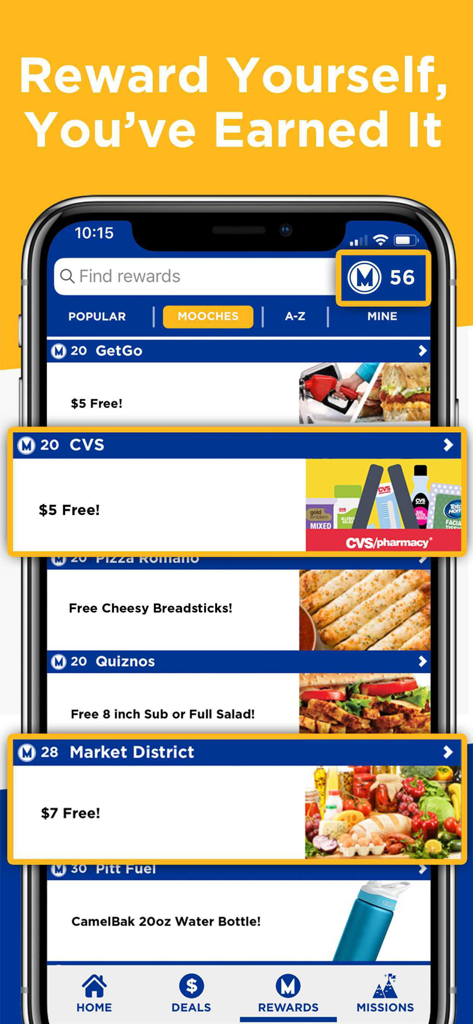 Earn "Mooches" - our loyalty points - when you pay with Pitt Fuel and complete special offers. Redeem Mooches for rewards - like cash back to the grocery store, electronics, or even gift cards - right in the app.