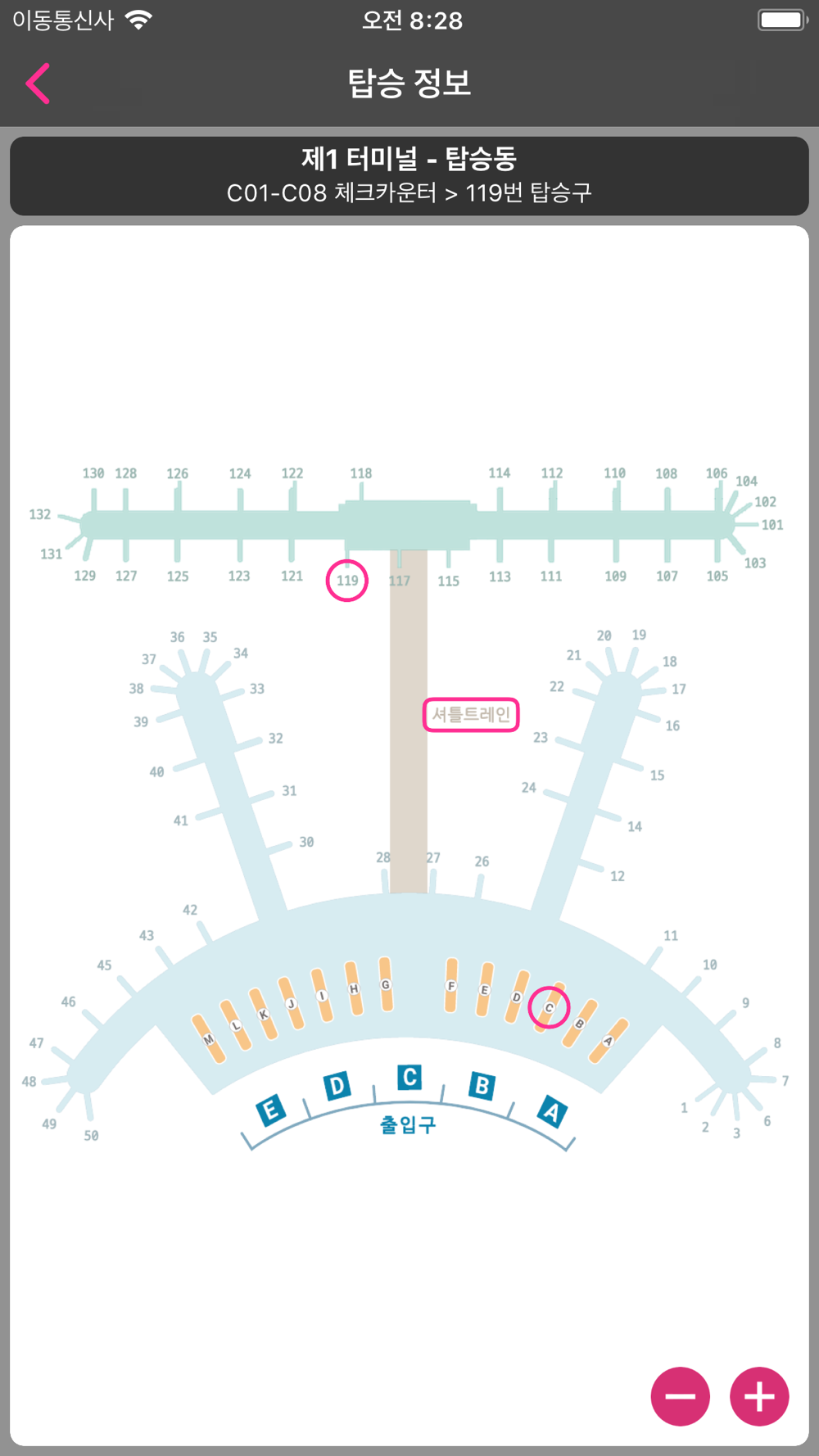 특정 항공편의 탑승 위치 또는 입국장 위치를 지도로 확인 할 수 있습니다.