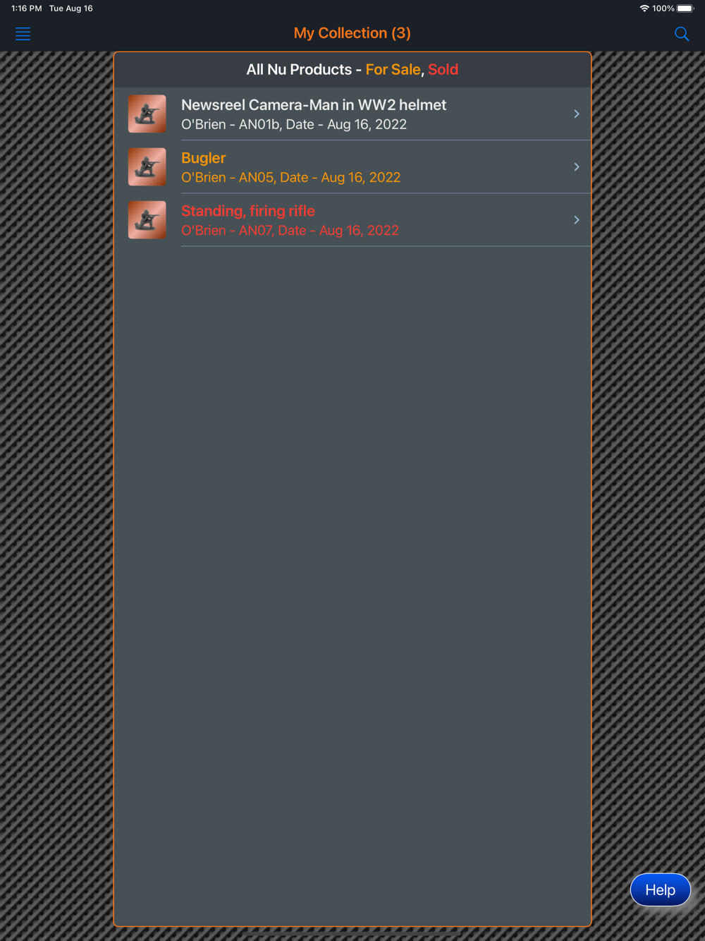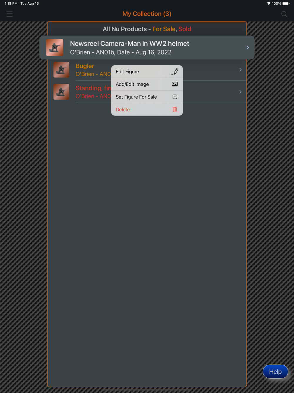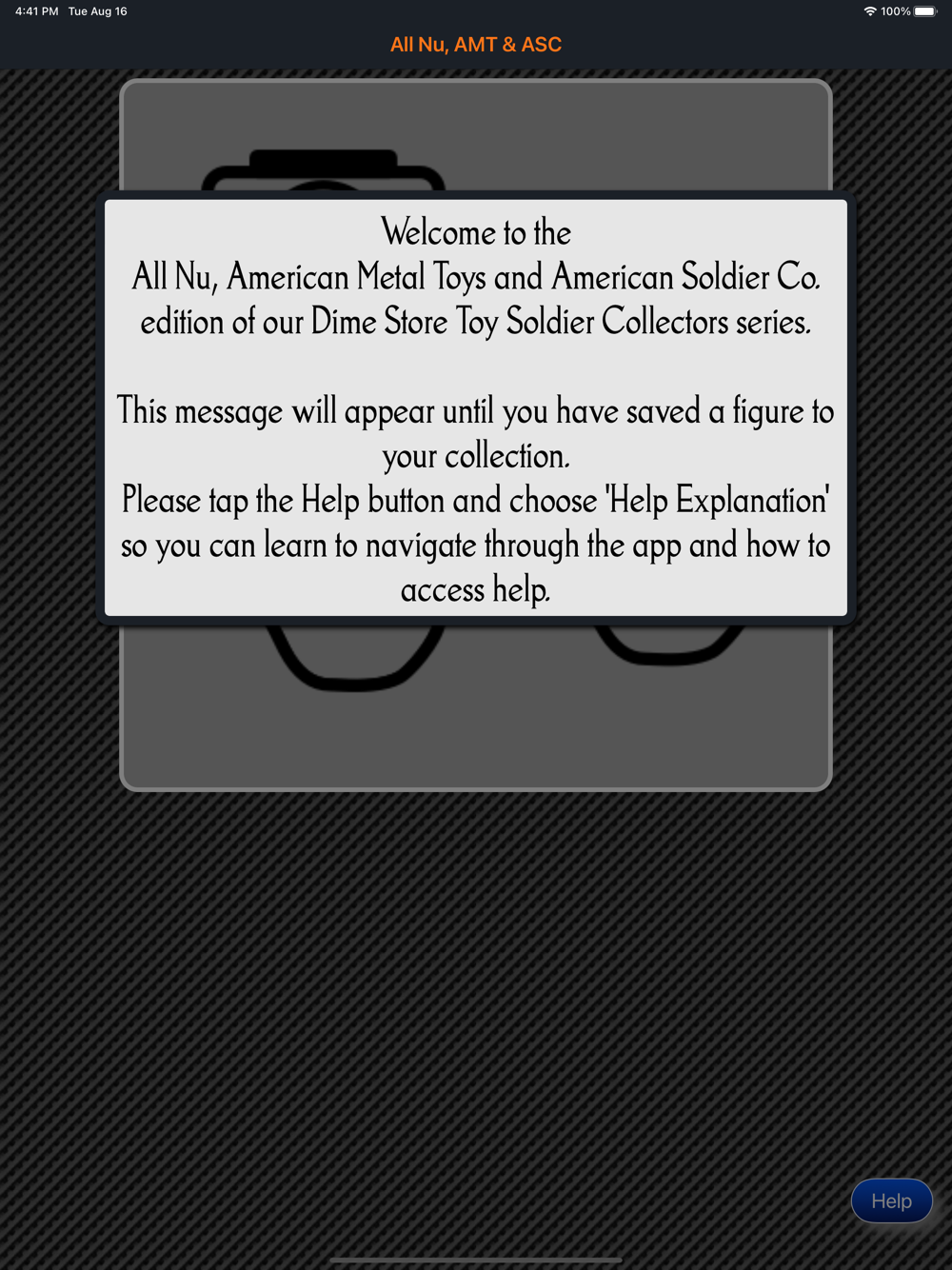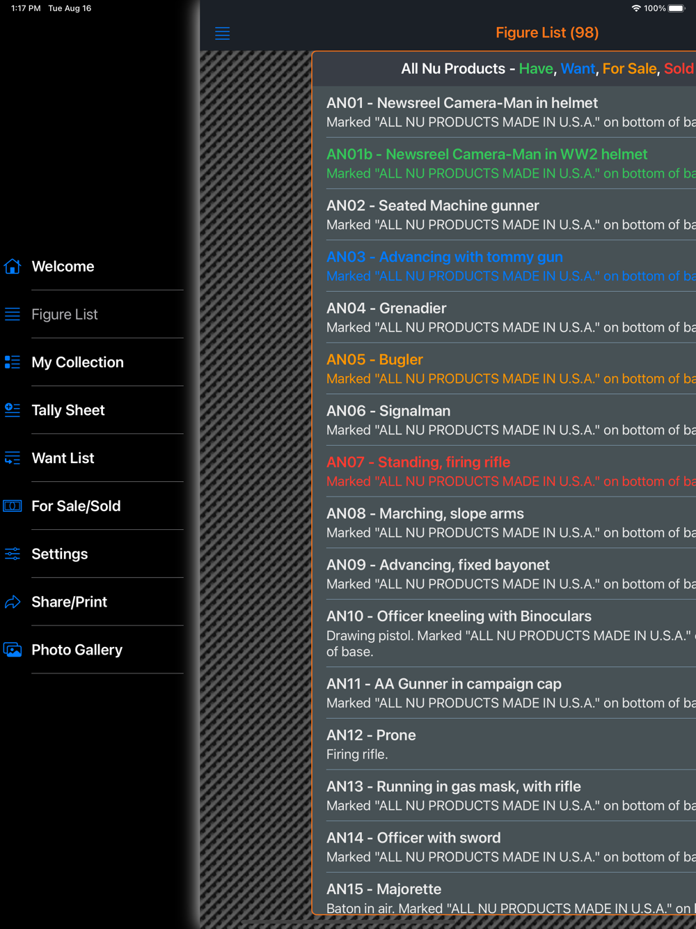 This app will provide the ability for the user to organize, track and manage their collection of All Nu Products, American Metal Toys and American Soldier Co figures. Images of each figure can be included with the collection. There is also a means within the app for the collector to peruse all of the images in their collection in an entertaining manner. The app has three (3) themes which help to make the app more enjoyable. A running tally of the cost for the entire collection is provided. A want list is also included in the app to allow the user to ear-mark figures that they are searching for.