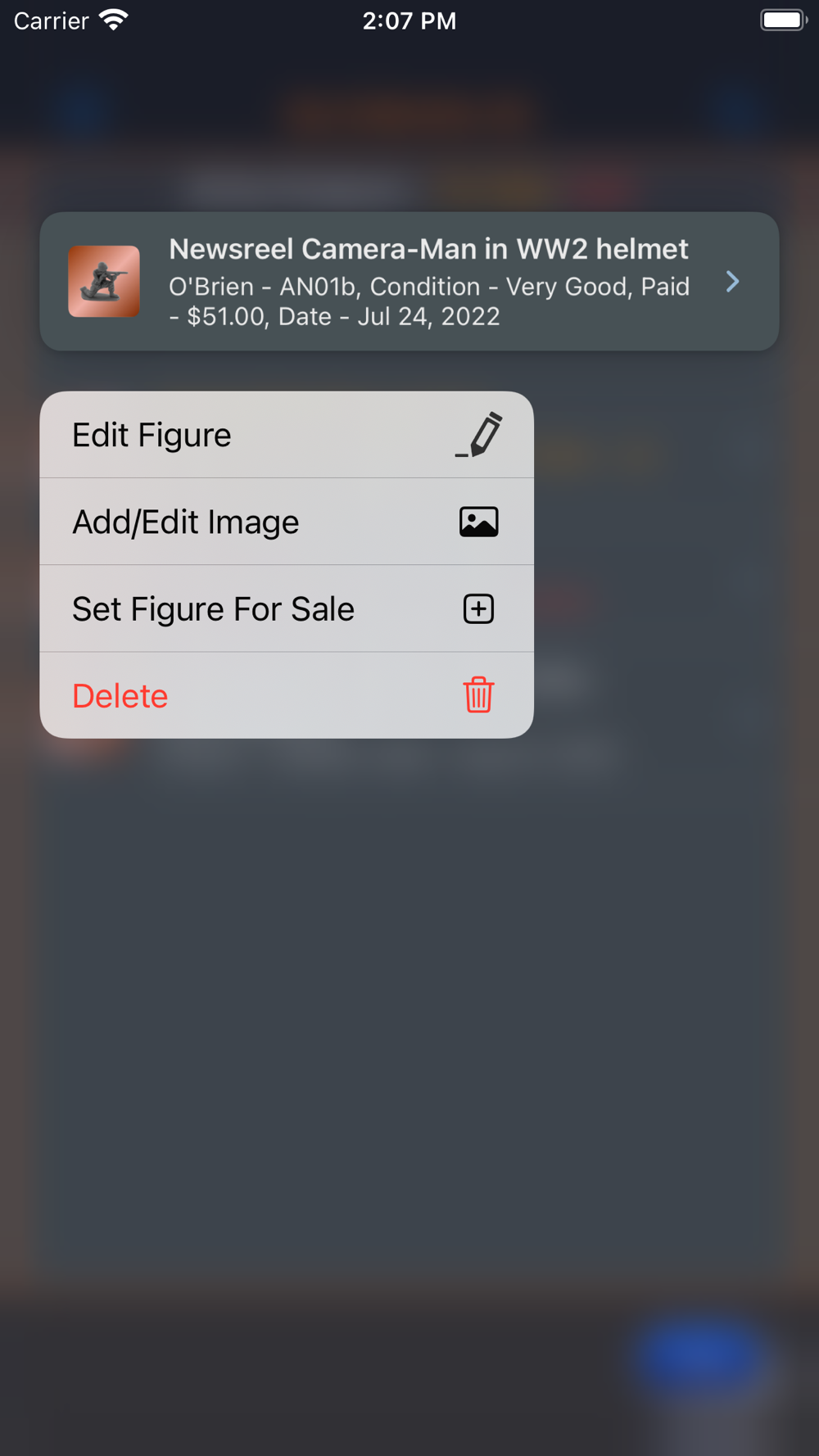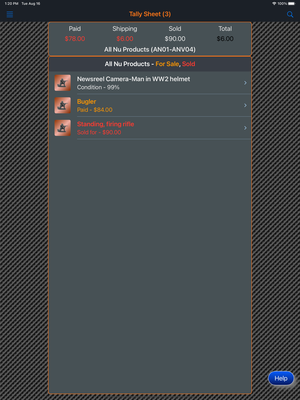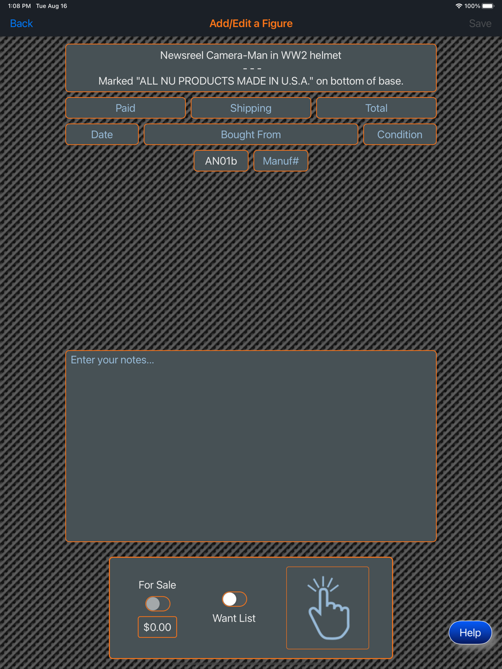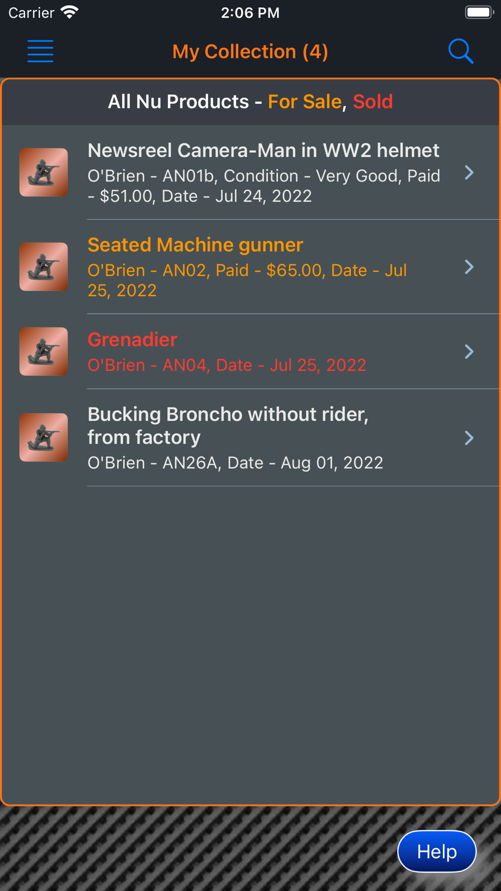 This app will provide the ability for the user to organize, track and manage their collection of All Nu Products, American Metal Toys and American Soldier Co figures. Images of each figure can be included with the collection. There is also a means within the app for the collector to peruse all of the images in their collection in an entertaining manner. The app has three (3) themes which help to make the app more enjoyable. A running tally of the cost for the entire collection is provided. A want list is also included in the app to allow the user to ear-mark figures that they are searching for.