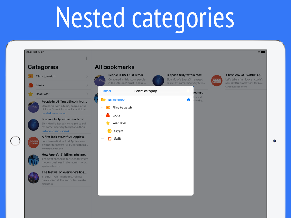 The download and usage of Bookmarks & Reading List app is free of charge. The upgrade to Premium provides access to the Today screen widgets, app icon unread counter, dark mode, PIN/TouchID support, app icon customization and more bookmarks layouts.