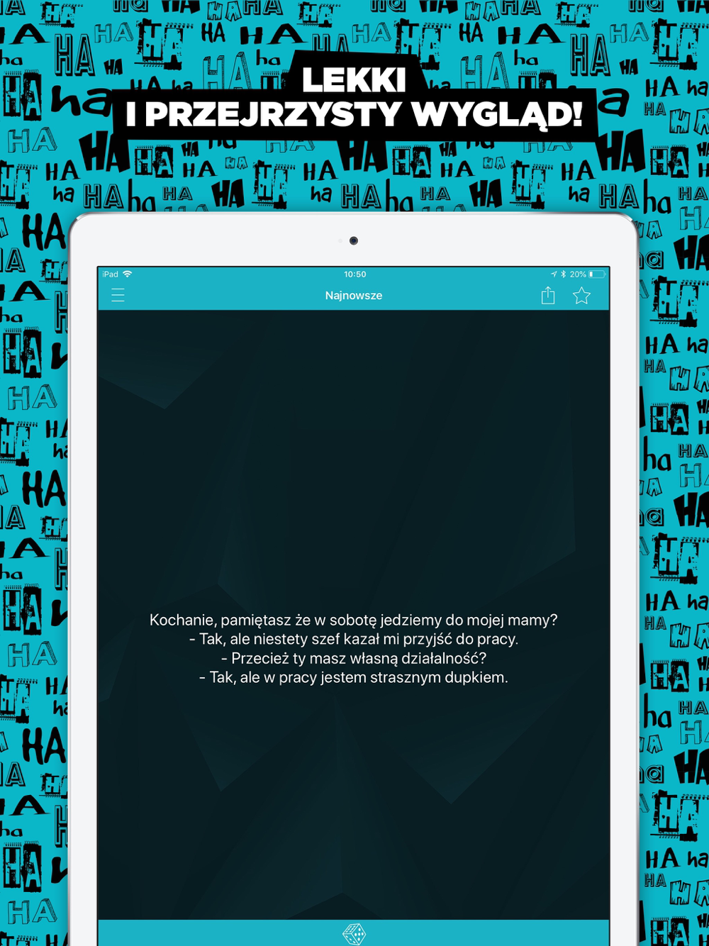 Któryś z kawałów bardzo ci się spodobał i chcesz do niego wrócić w przyszłości? Dotknij gwiazdkę, która znajduje się w prawym, górnym rogu ekranu, a kawał zostanie zapisany w ulubionych. Zbiór ulubionych dowcipów znajdziesz w głównym menu aplikacji.
