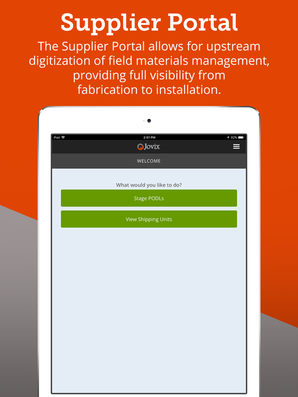 Jovix® is a Material Readiness™ Solution developed for the purpose of driving construction craft labor wait time related to materials to zero. According to CII, COAA and Fiatech Studies, direct labor work typically amounts to no more than 35-45% of a craftsman’s time on the job. A large percentage of the non-productive direct labor time can be attributed to waiting on materials. The Jovix solution enables construction-centric, digital and mobile field materials management work by providing real-time, geo-contextual, and relational visibility regarding construction materials from fabrication to installation. Jovix provides value for Owner/Operators, EPC firms, contractors, fabricators and suppliers by removing impediments to productivity that result from material management issues.