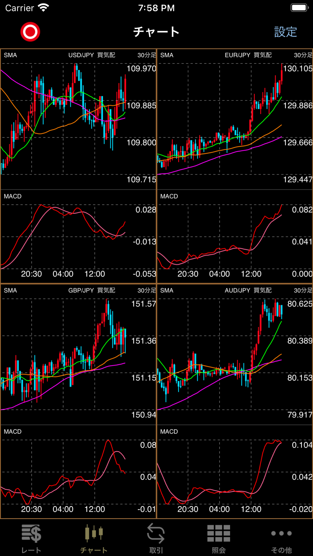 2画面、4画面の分割表示により相場のトレンド分析が可能です。