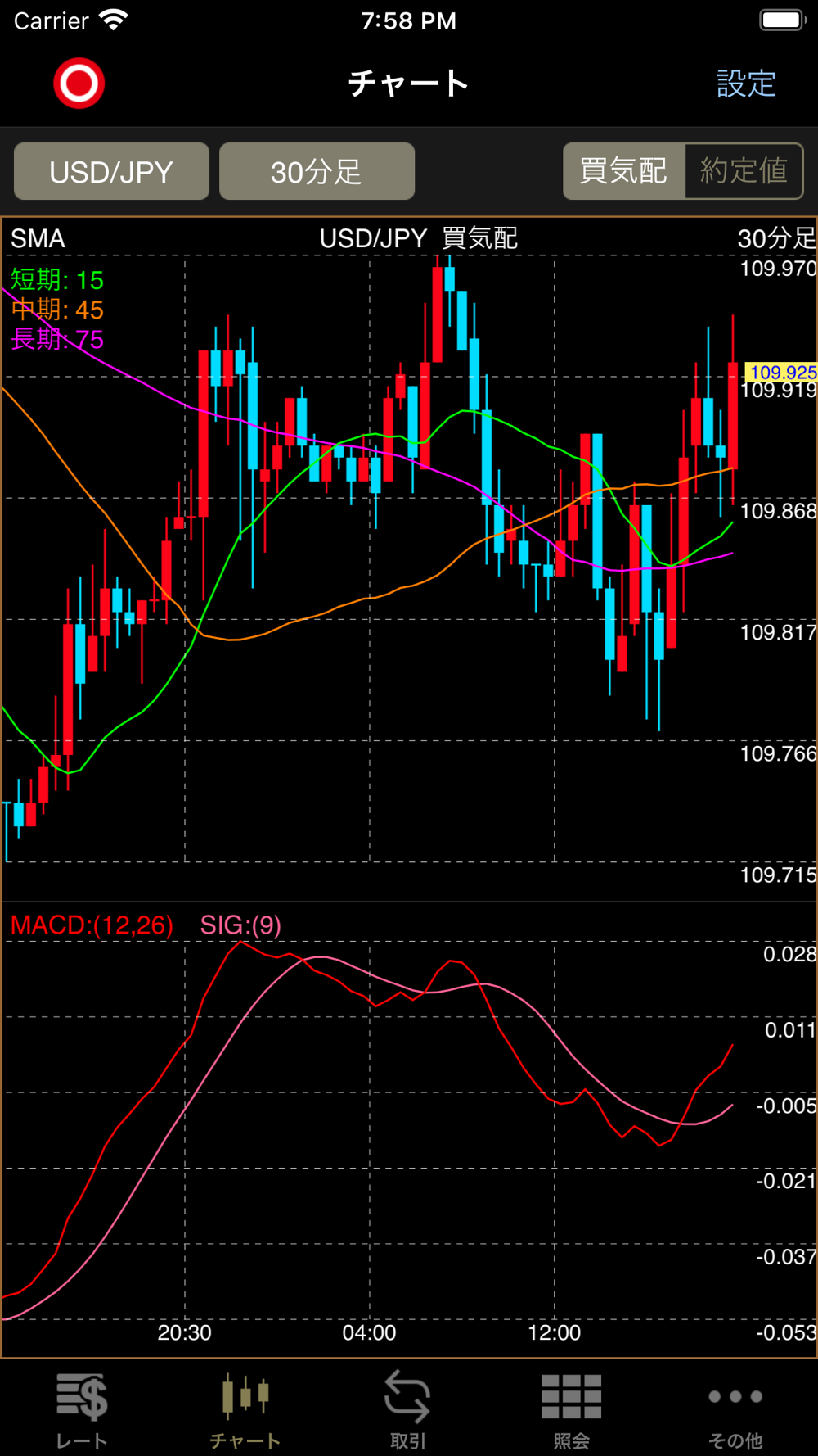 リアルタイムのチャート描画にくわえ、31種類の豊富なテクニカル指標や自動トレンドライン表示によりチャート分析を強力にサポートします。