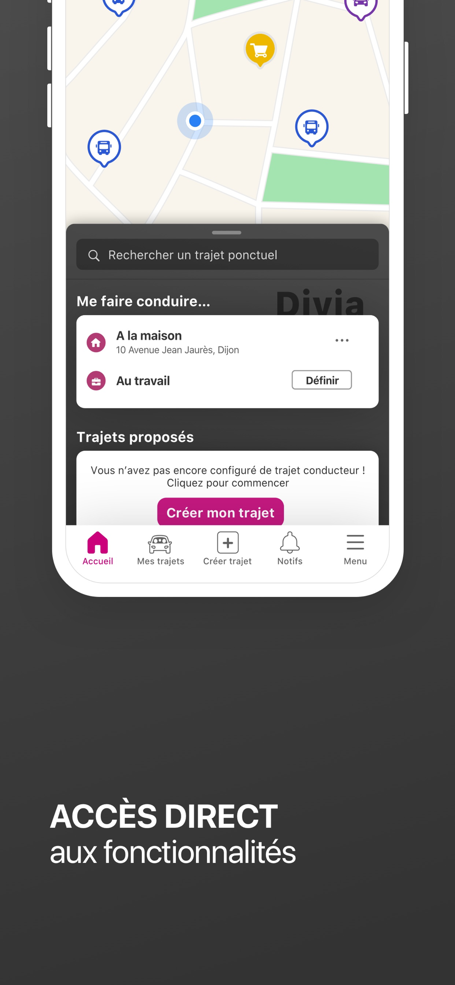 TROUVEZ DES PASSAGERS OU DES CONDUCTEURS : Vous voulez covoiturer dès que possible ou bien planifier un trajet ? Ouvrez l’application, indiquez votre destination et l’heure de départ ou d’arrivée souhaitée. Si vous êtes passager, Divia Covoit' vous indique les conducteurs qui réalisent le même trajet et vous n’avez plus qu’à répondre à l’annonce. Pour les conducteurs, une notification vous sera envoyée quand un passager est intéressé par votre trajet.