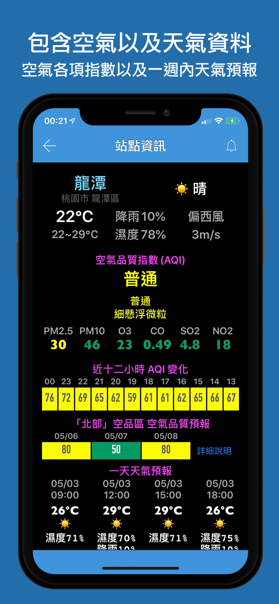 - 詳細頁面除了 AQI 以及近 12小時內 AQI 變化之外,提供 SO2、NO2、PM10、PM2.5、O3、CO,一天以及一週內的天氣預報。此頁右上角按鈕,可設定推播通知功能。