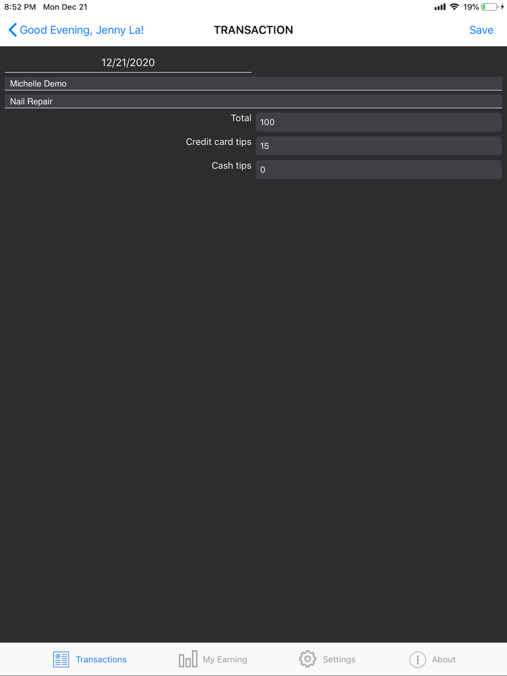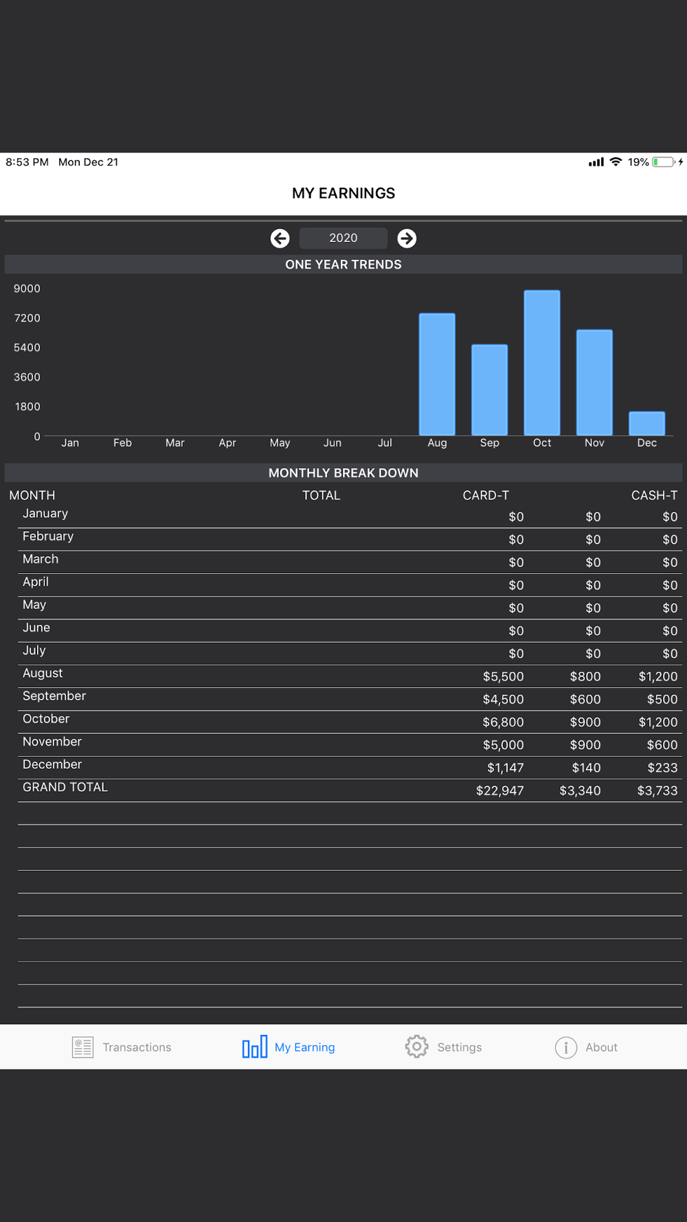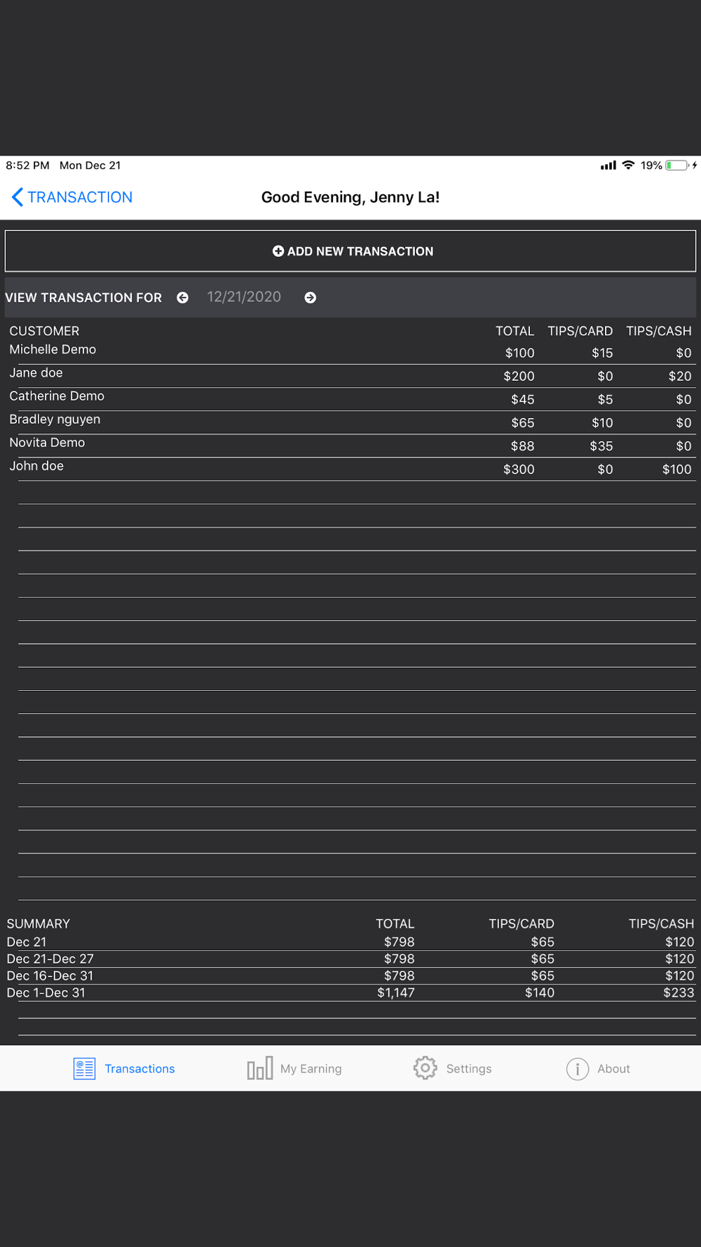-View total earning & tips for daily, weekly, bi-weekly, monthly & annually