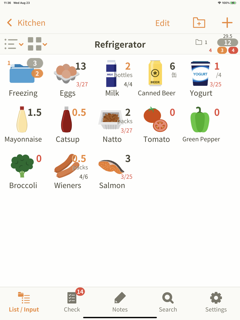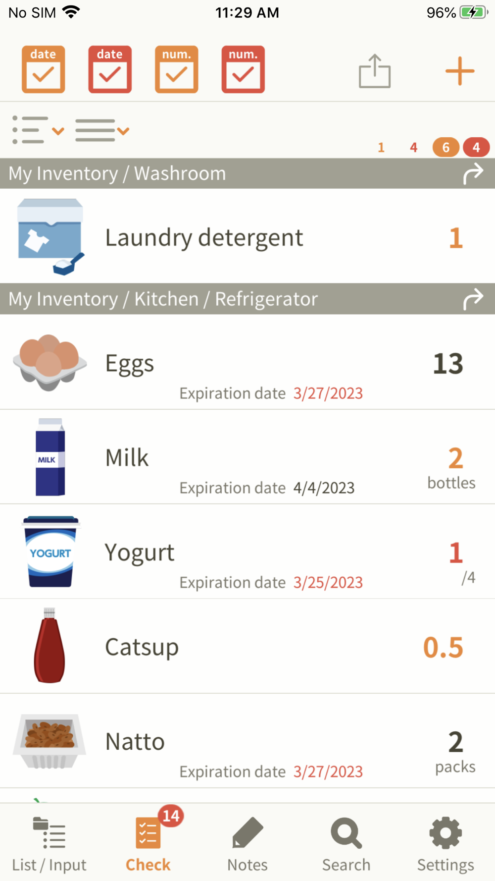 Enter the number of pieces or expiration date of the commodities in your fridge or kitchen storage, for example. Then subtract number when you use them or add when you restock the products.