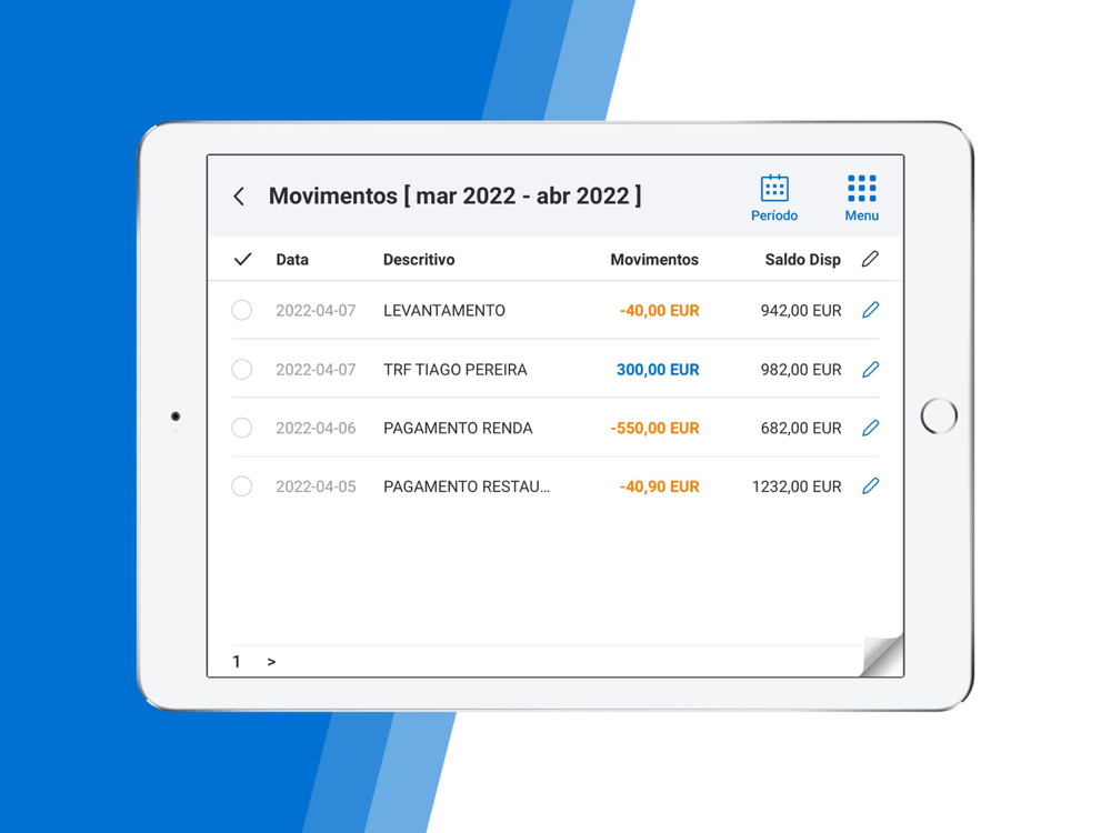 Na Aplicação é simples e fácil consultar saldos, validar movimentos, podendo incluir e gravar comentários, assim como obter ajuda telefónica com o nosso Contact Center, bastando para isso um simples toque no ecrã.