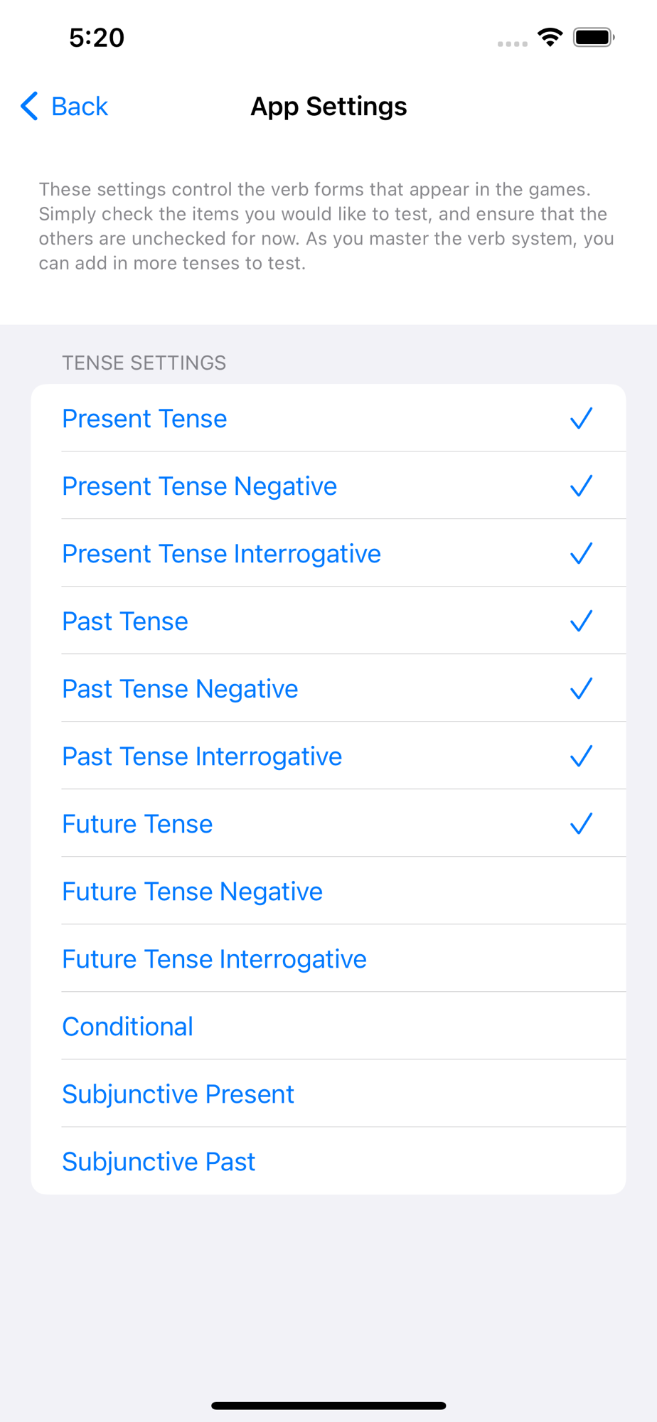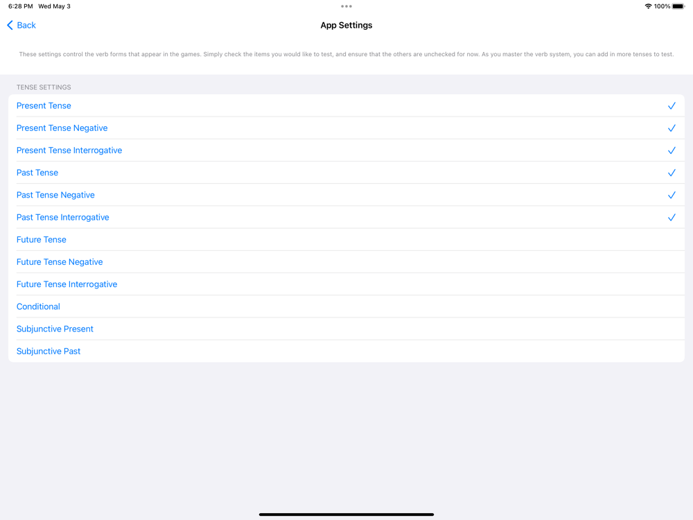 As well as a verb reference, there is a set of intensive verb drill activities to quiz your conjugation knowledge, including: