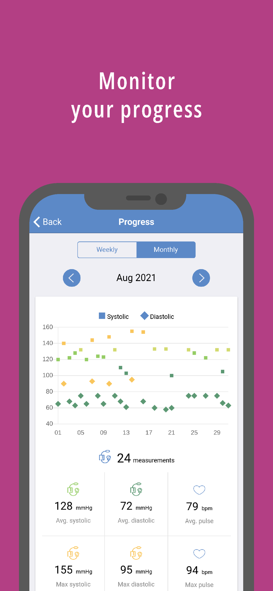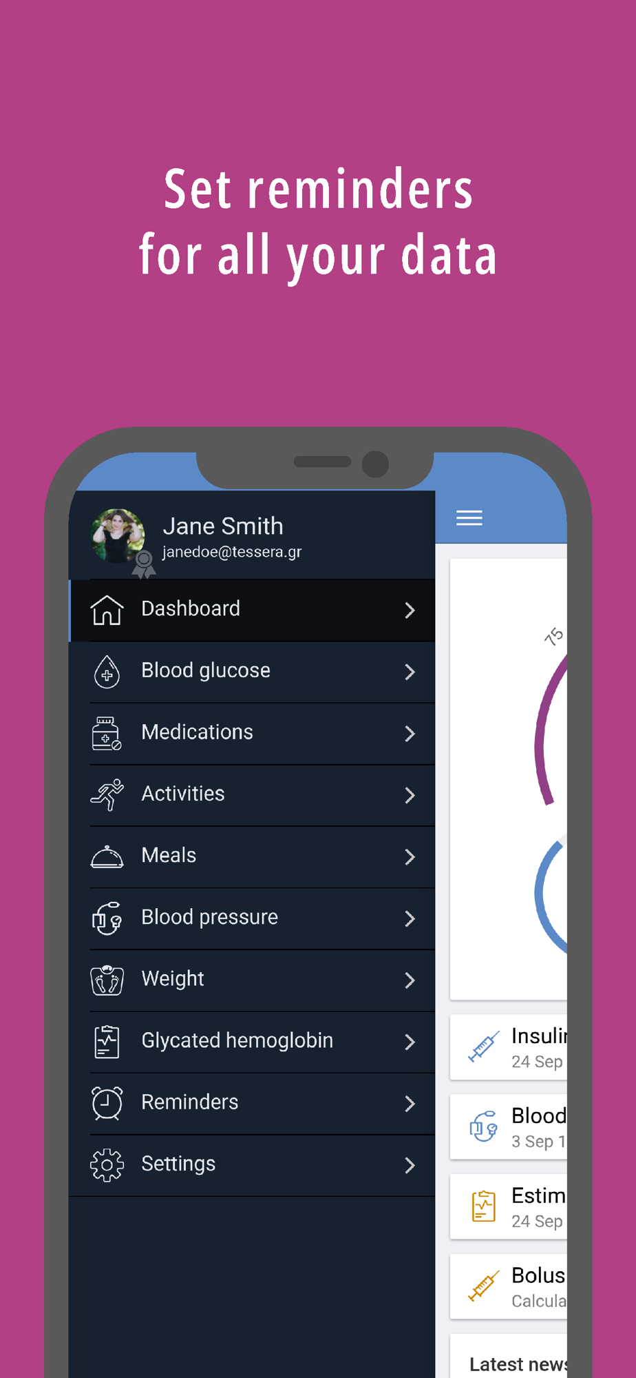 - See your progress with useful charts based on your defined goals for: blood glucose, meals, activities, weight, blood pressure etc