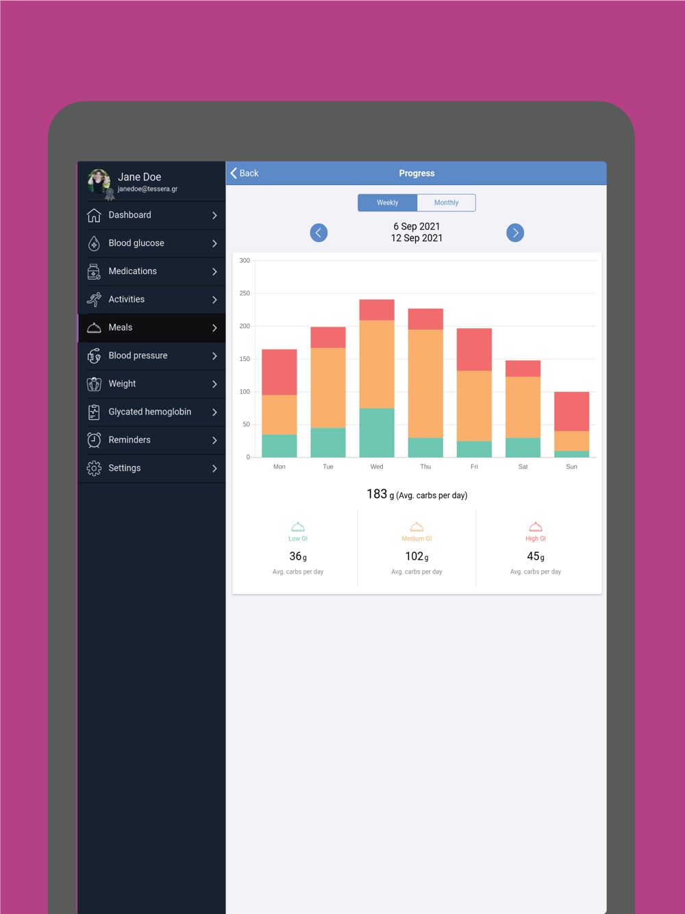 - Setup goals for: blood glucose range, daily activity, daily carbs etc