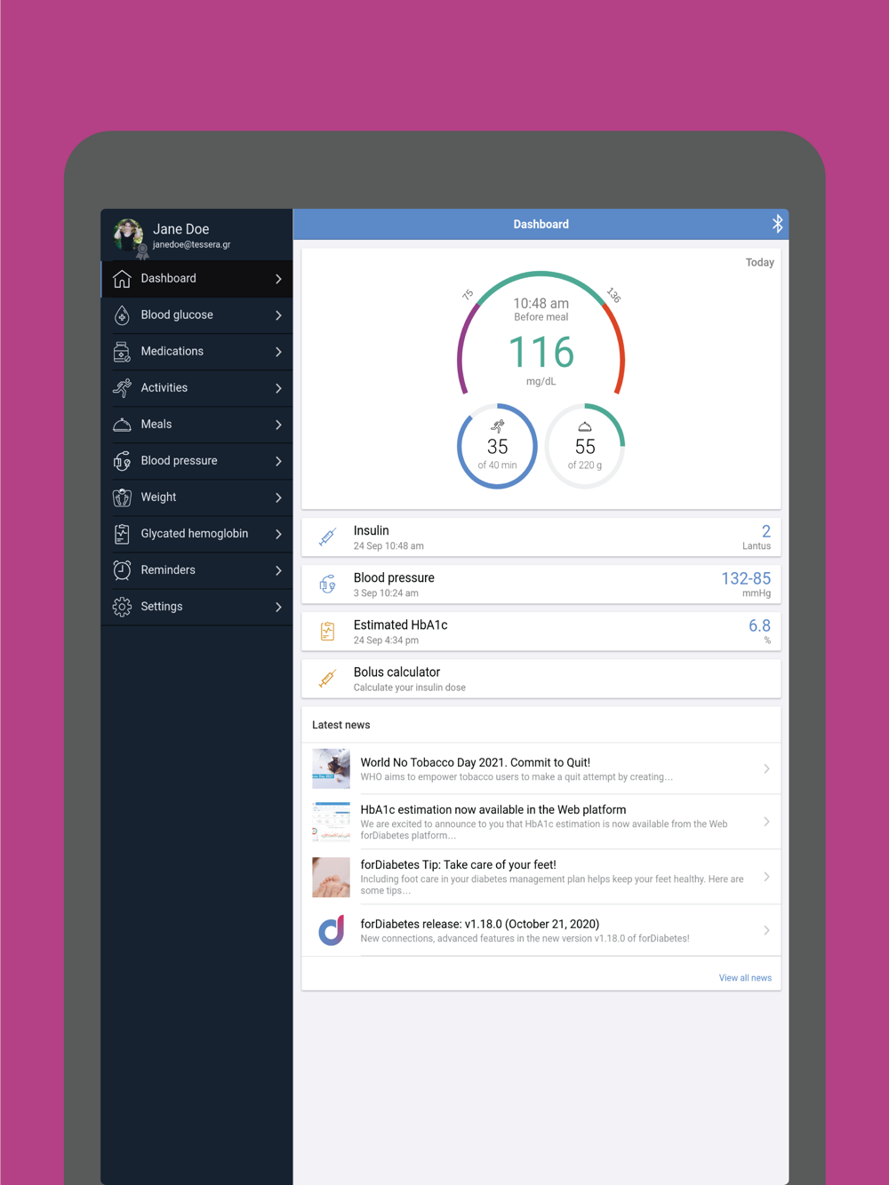 forDiabetes app is a handy tool for the management of diabetes (Type 1, Type 2, LADA, gestational diabetes or pre-diabetes). It keeps record of all key diabetes data (blood glucose level, activity, carbs, blood pressure, HbA1c, weight, medication etc), it analyzes data and exports detailed reports that enables your everyday life.