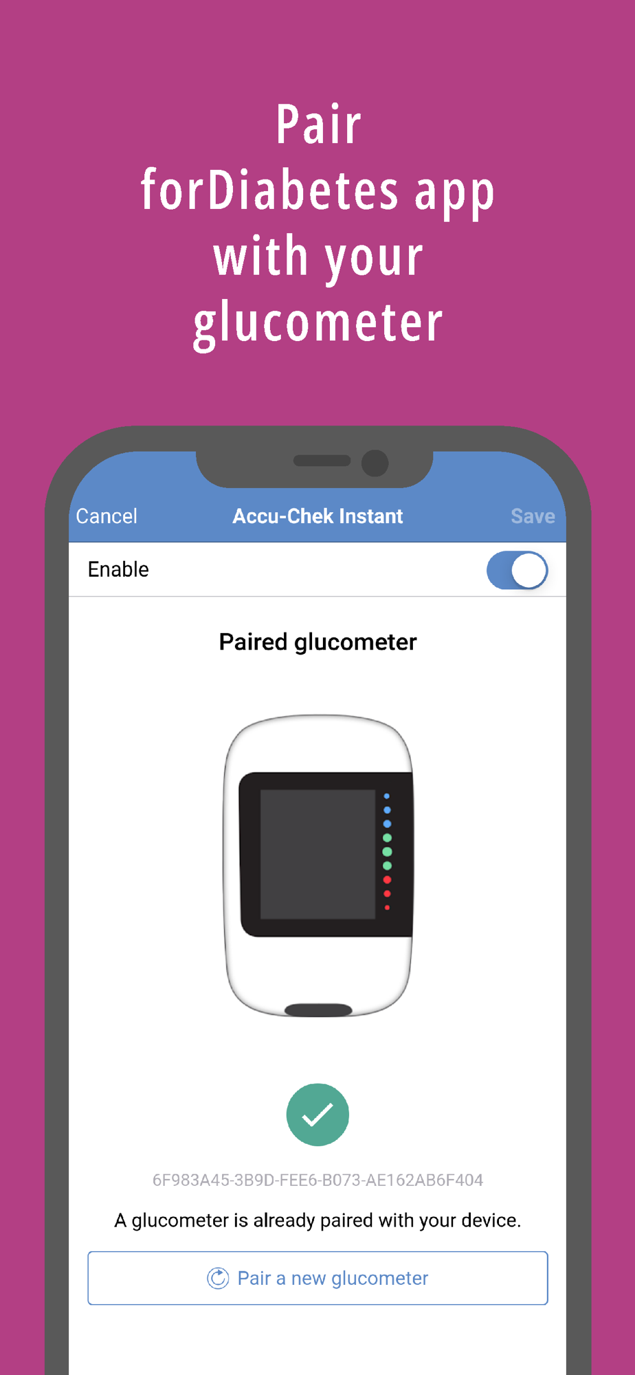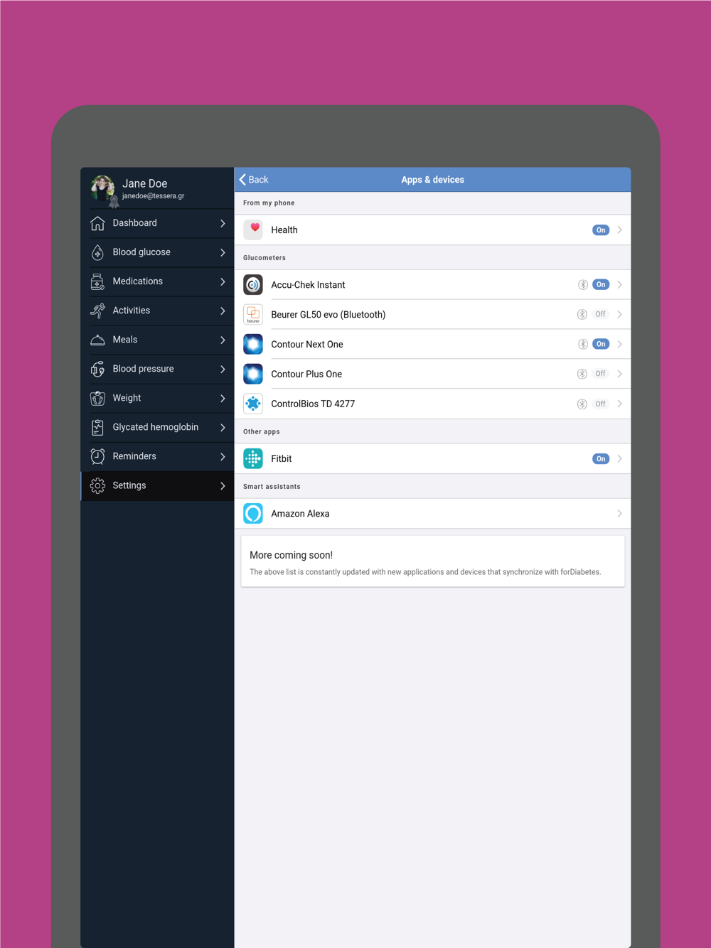 - Automatic data entry using 3rd-party apps and glucose meter devices with Bluetooth or NFC connection like: Fitbit activity trackers, Contour Next ONE & Contour Plus ONE glucometers, GlucoMen areo & GlucoMen areo 2K glucometers, Accu-Chek Instant, Beurer GL50 evo glucometer, Control Bios TD-4277 glucometer etc