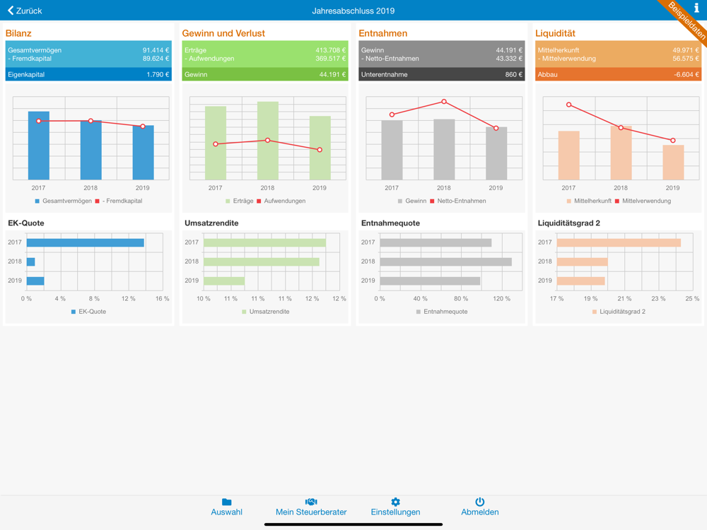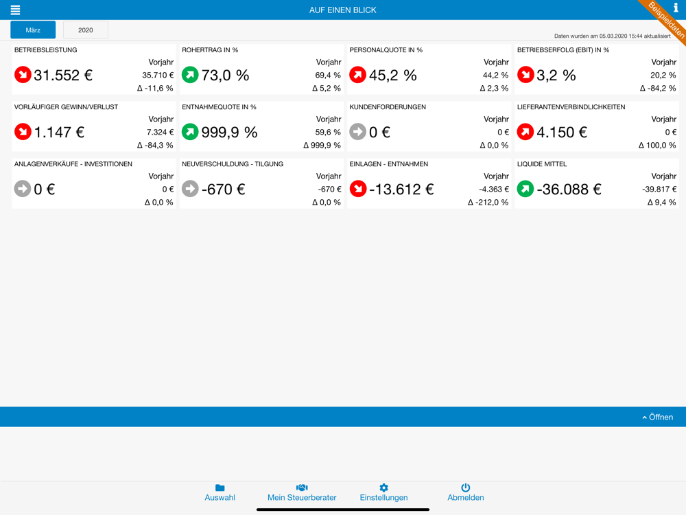 Die App verwendet den Zugang zu Ihrem von uns eingerichtetem sicheren Mandantenportal und setzt die dort bereitgestellten Daten in eine mobile betriebswirtschaftliche Auswertung um. Damit haben Sie Ihre Unternehmenszahlen sehr viel schneller zur Verfügung und das an jedem beliebigen Ort, an dem es eine Internet-Verbindung gibt.