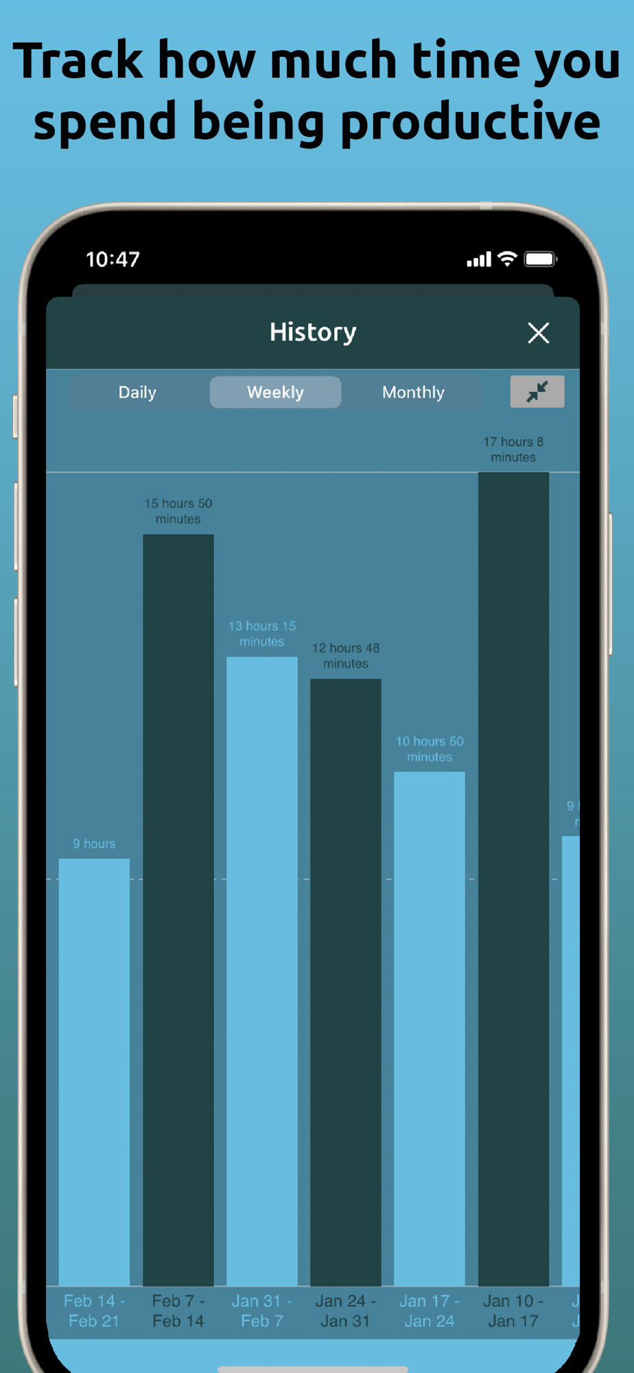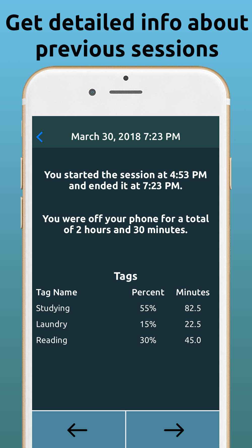 HISTORY – At any time you can check the history of sessions to see what you worked on in the past. You’ll see when you were off your phone and what you did while off of it.