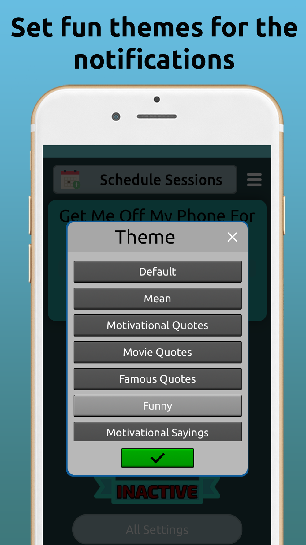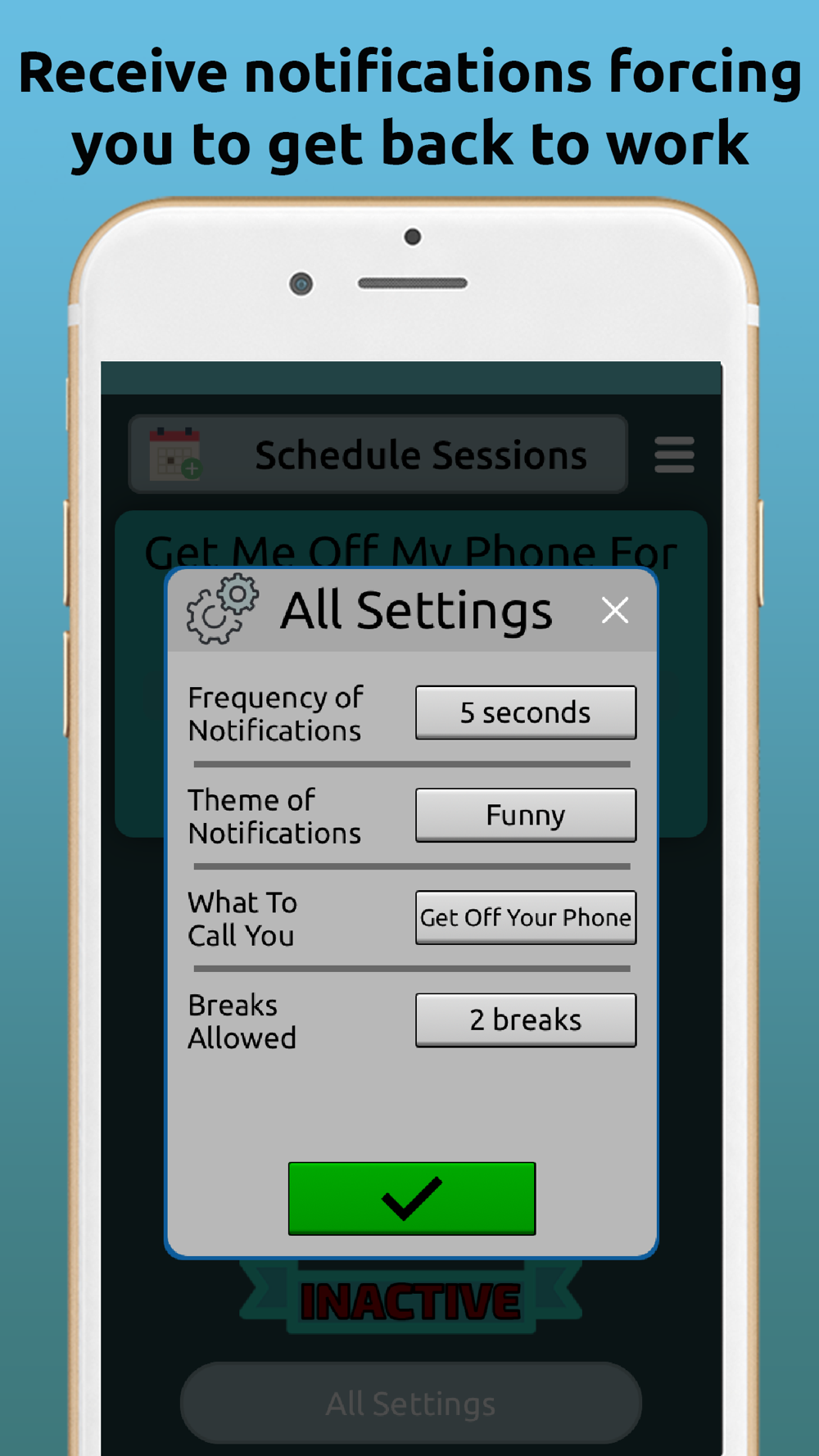 NOTIFICATIONS – The notifications are what keeps you focused and off your phone. You can customize the frequency and theme of them. You can set the frequency anywhere from 2 to 10 seconds. You can also change the text of the notifications to various fun themes such as movie quotes, inspirational quotes, or you can make them mean to give you that extra bit of inspiration to get back to work.