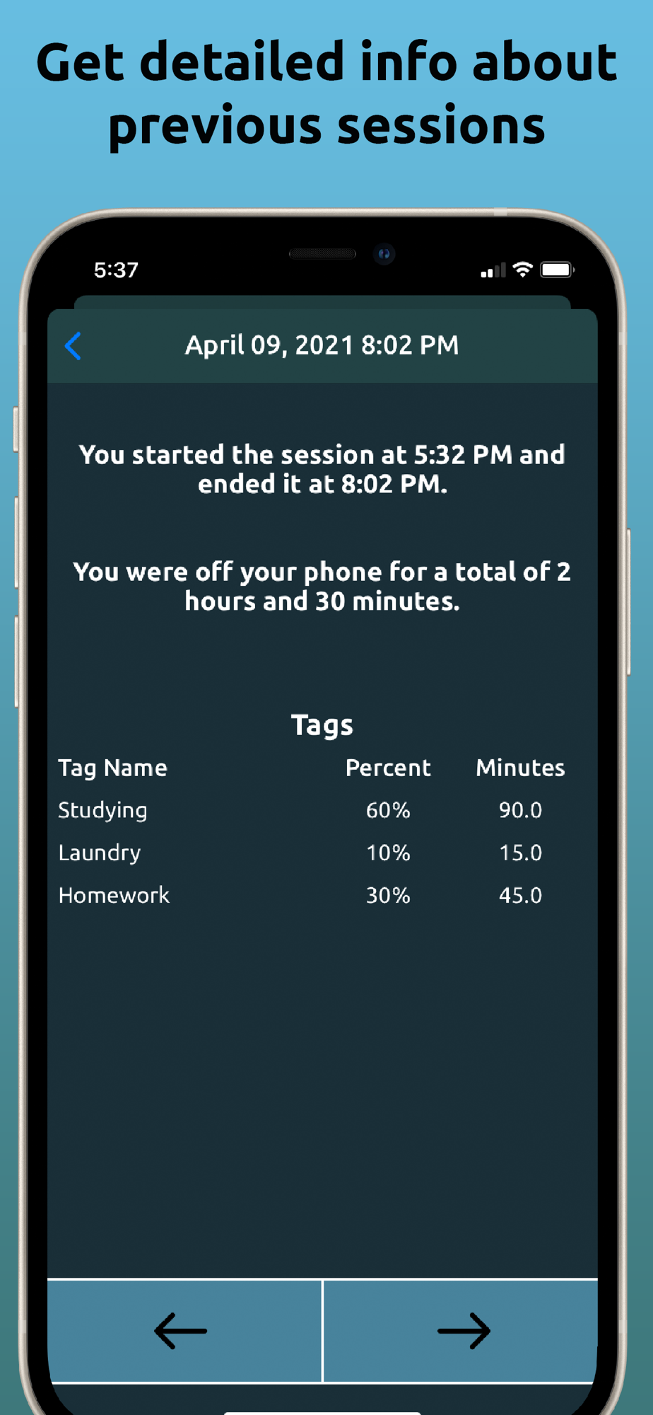 TAGS – Set up to three tags for each session. These tags allow you to keep track of what you worked on during the time you were off your phone. You can then check how often and for how many hours/minutes you have used these tags.