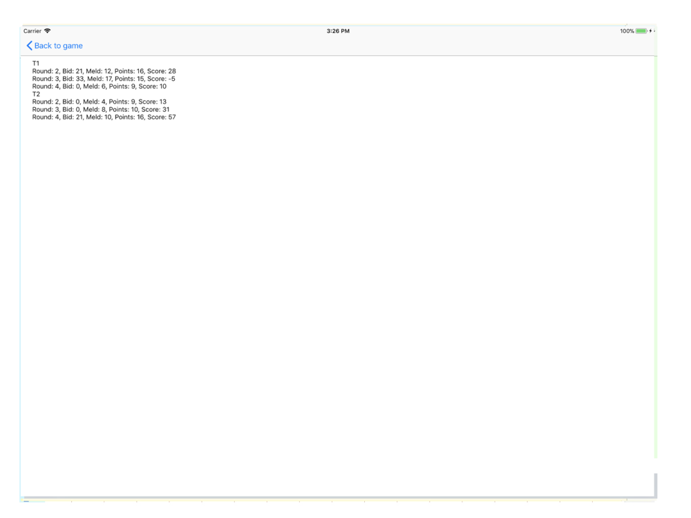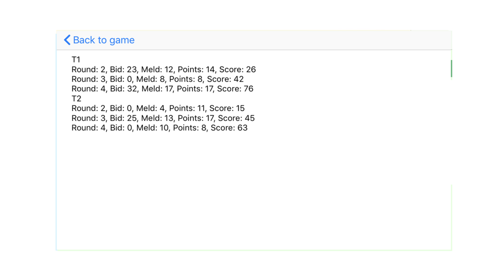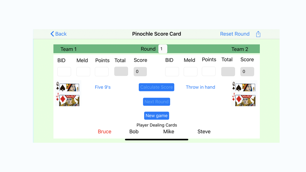 Tired of manually keeping score when playing Pinochle. No longer. This app allows you to enter the BID, Meld and Points and it automatically calculates the total score for both teams. In addition when you enter the points it automatically enters the remaining points for the other team. The app allows you to display the scoring for each round played. At the bottom it will also display in RED the player that deals the next round. It also keeps previous games until you wish to erase them. So for example, if you play 7 rounds all of those rounds will be displayed in the View Round window. This allows you to see each round and how each game was won. But remember, when you are ready, you need to select the option to erase all games. This will clear out that history and start fresh the next time you play Pinochle.