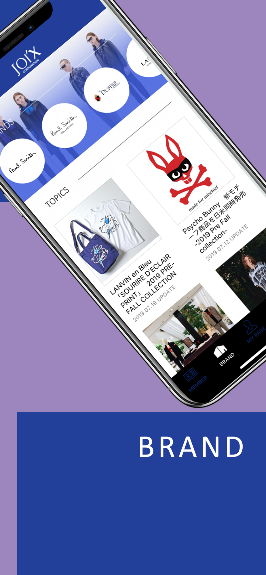 Paul Smith、Paul Smith COLLECTION、LANVIN COLLECTION、LANVIN en Bleu、The DUFFER of St.GEORGE、Vivienne Westwood MAN、Psycho Bunnyのブランドを扱うJOI'Xコーポレーションの公式メンバーズカードアプリです。