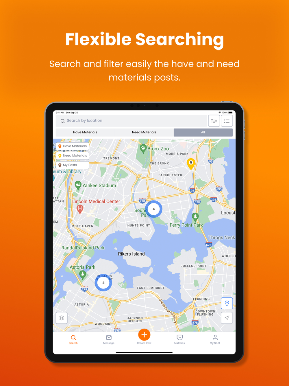 Users can search the map to find posts in their area, view a list of posts that match their needs, message other users to coordinate pickups, and more.