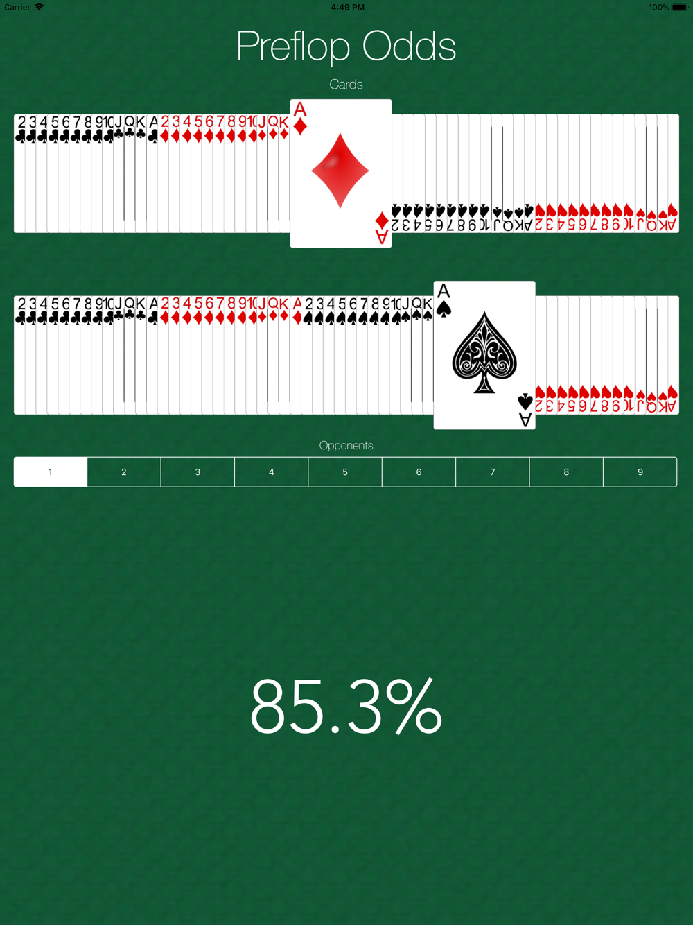 Simply pick your two cards and whether or not they are of the same suit. Then select the number of opponents. Preflop Odds will show you the % of times your hand will win or tie.