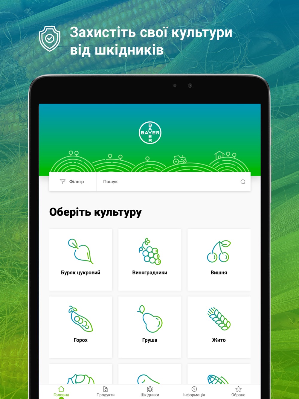 • ви хочете дізнатися відразу, які продукти компанії «Байєр» зареєстровані на вашу культуру: заходьте в розділ Продукти та вибирайте Захист культур;