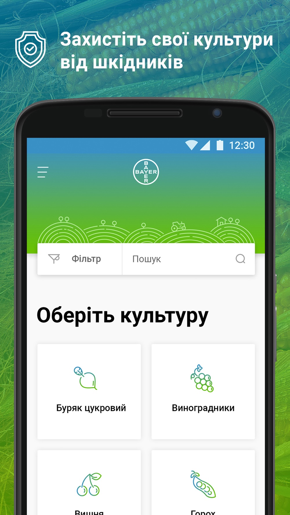 • вам цікаво, які бур'яни або комахи поширені на вашій культурі: тоді безпосередньо з головної сторінки додатка вибирайте культуру, переглядайте перелік шкідників, фільтруйте їх та вибирайте необхідний захист;