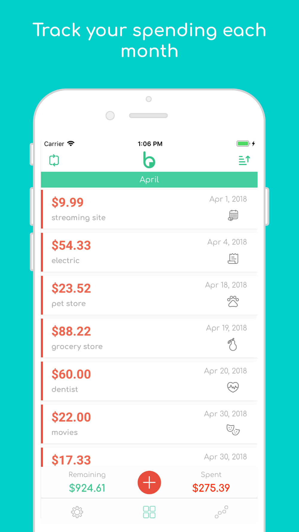 Set a monthly budget amount and each transaction you enter will track your goal progress.