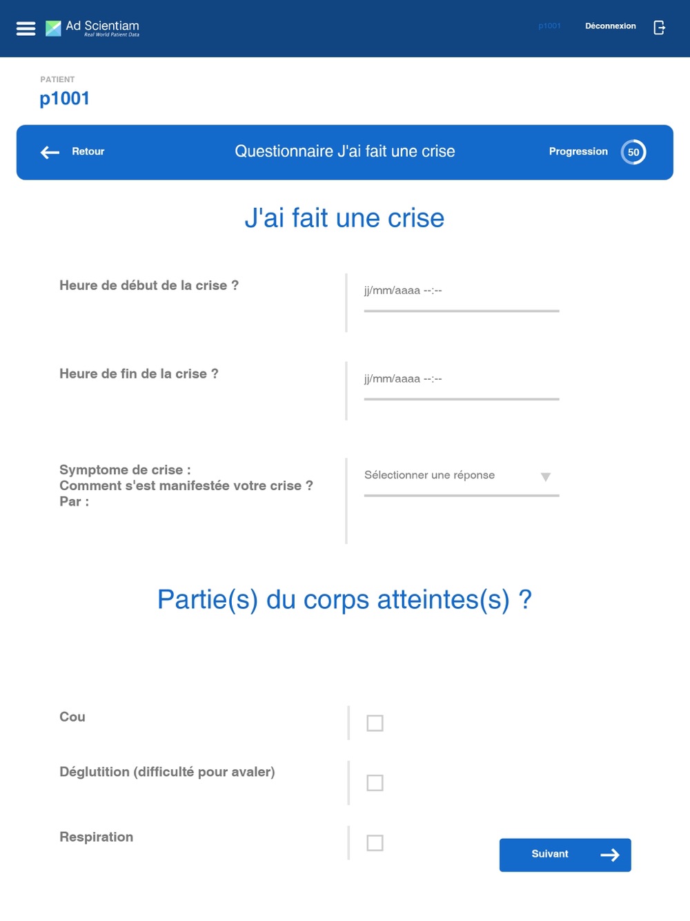 Les données recueillies sont directement saisies par le patient, sécurisées (hébergeurs agrées données de santé) et visualisables par les investigateurs en temps réel via une plateforme web incluant un tableau de bord.