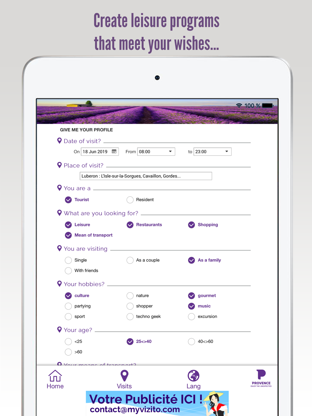 Bienvenue en Provence suggests you the first collaborative intelligence engine which guides you during your trip to build your own tourist itinerary. Pick the picturesque, the exceptional and the unexpected: An avatar suggests you to build your own tourist itinerary according to your centers of interest. Let yourself be guided: Once the itinerary is finalized, you are guided on a map, can book your tickets and have an unforgettable visit!