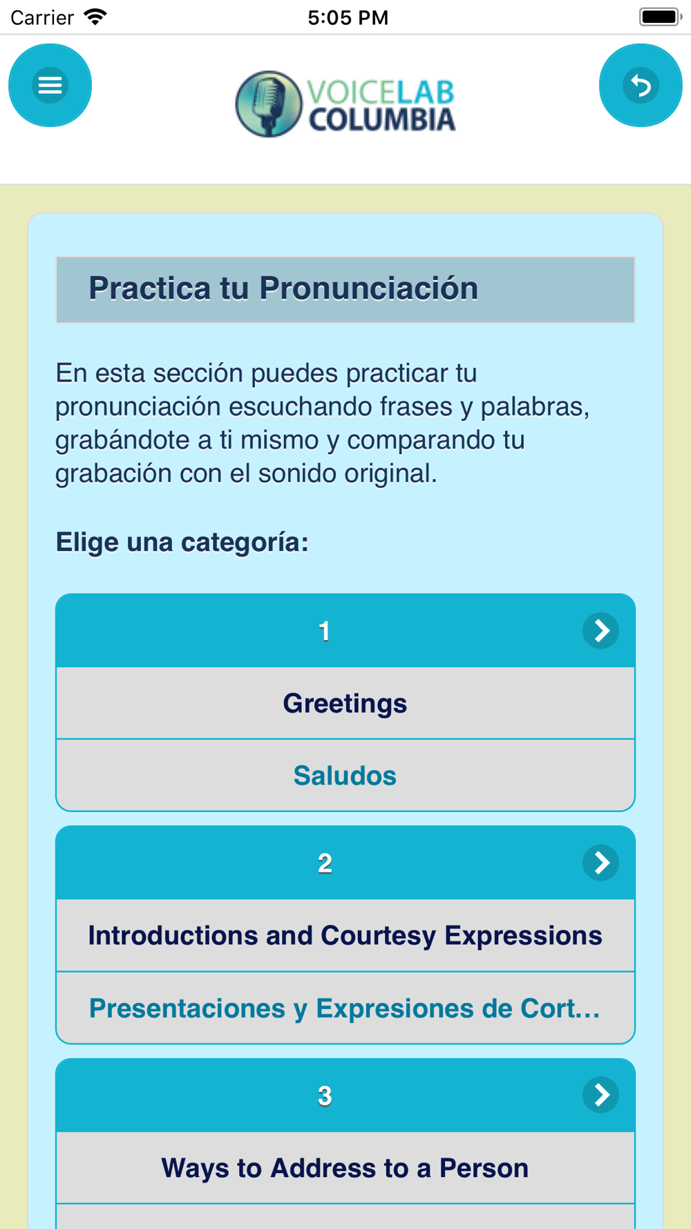 VoiceLab Columbia te ofrece la posibilidad de practicar la pronunciación de 1000 palabras y frases comunes de inglés americano.