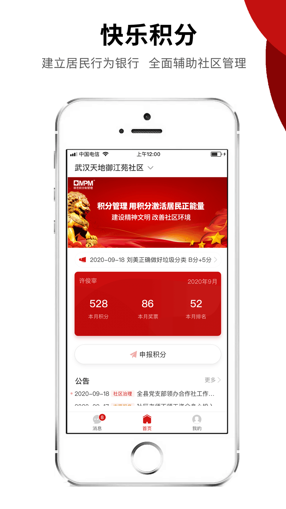 社区积分制管理是通过“奖分”与“扣分”对居民的社会行为进行综合评价的新型社区治理软件。社区在软件上为居民建立“行为银行”,正能量的行为通过奖分进行认可,负能量的行为则用扣分给予提醒。社区通过积分排名将社会资源及福利待遇优先匹配给排名靠前的居民,真正做到了公平、公正、公开,形成了一套让老百姓服气的评价体系。
