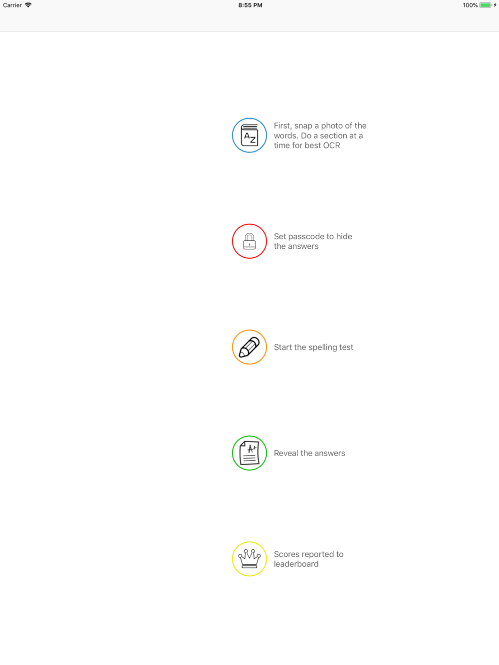 Use SnapSpell to snap a picture of the words from the spelling assignment, set a passcode, and let it conduct the spelling quiz.