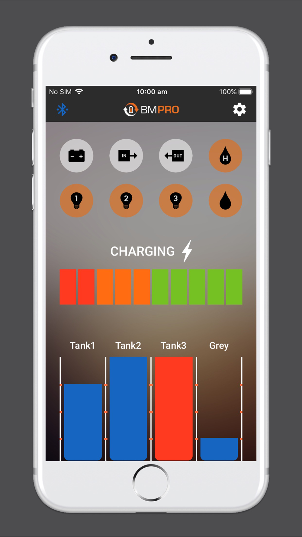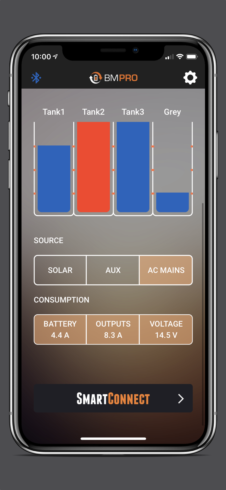 Get detailed views of your current power source (solar, auxiliary, or mains). Check consumption indicators (output voltage, output amps, and battery amps) and your Battery’s State of Charge, to get a complete view of your power system’s time remaining. Better manage appliances in your van for longer battery life.