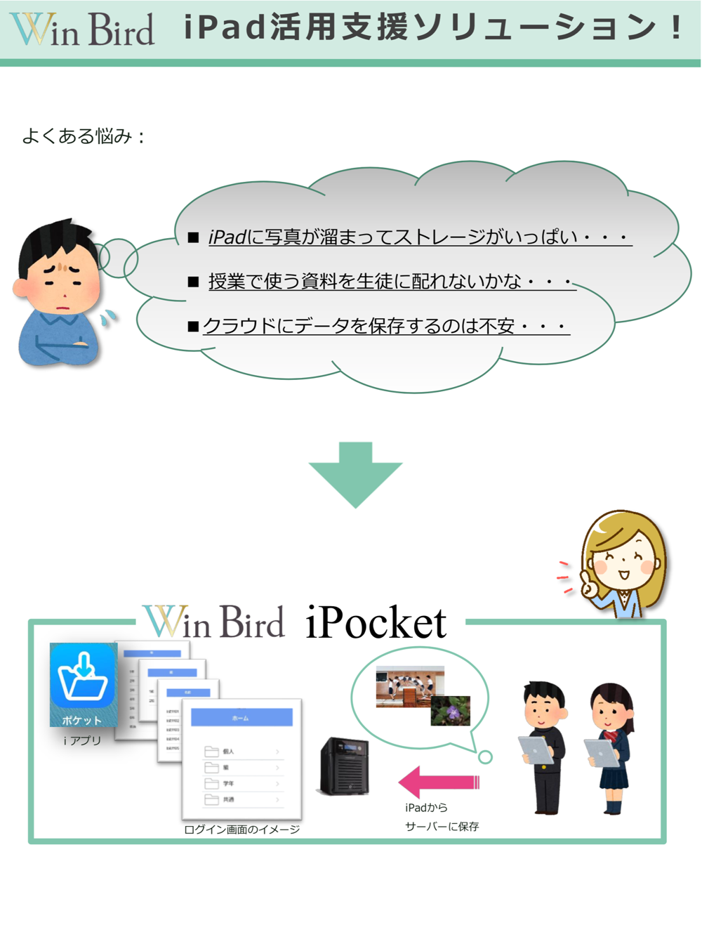 ご使用になるには、学校向けサーバー製品「Win Bird iPocketサーバーVer1.2」が別途必要です。