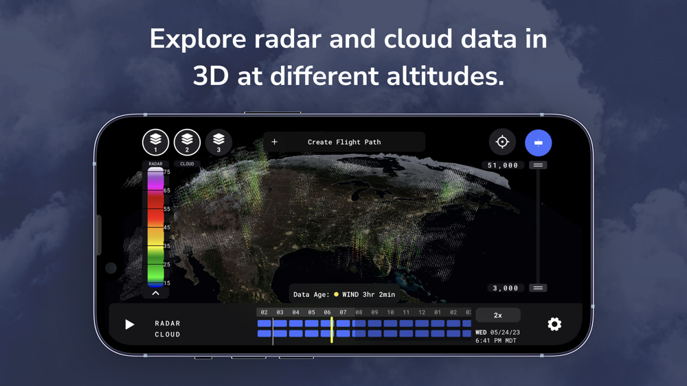 Volumetric 3D weather for pilots and weather enthusiasts. Multiple layers and altitudes can be shown at once in a high performance rendering environment to quickly absorb information and get the big picture in seconds.